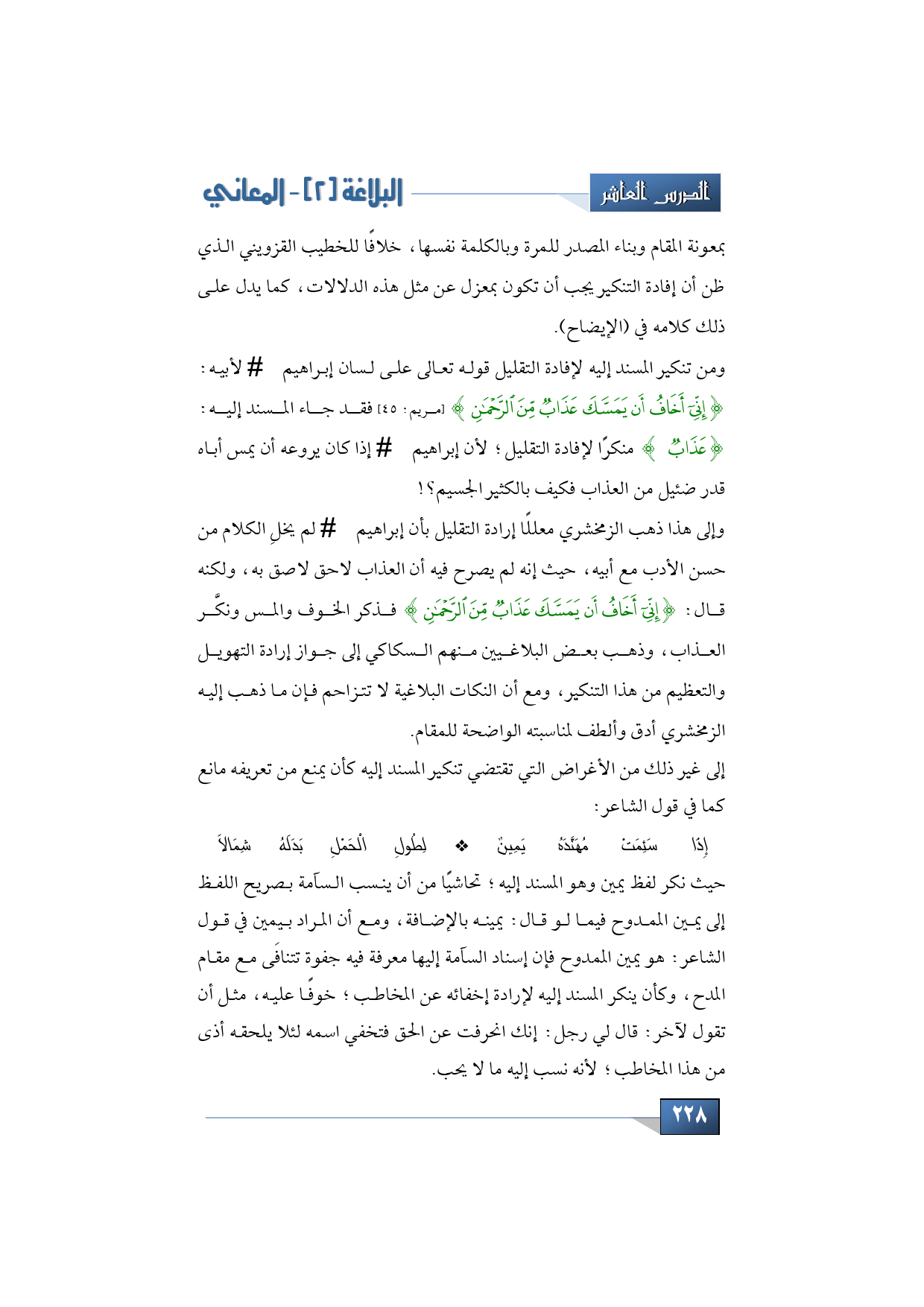 وإلى هذا ذهب الزمخشري معللًا إرادة التقليل بأن إبراهيم - عليه السلام - لم يخلِ الكلام من حسن الأدب مع أبيه، حيث إنه لم يصرح فيه أن العذاب لاحق لاصق به، ولكنه قال: {إِنِّي أَخَافُ أَنْ يَمَسَّكَ عَذَابٌ مِنَ الرَّحْمَنِ} فذكر الخوف والمس ونكَّر العذاب، وذهب بعض البلاغيين منهم السكاكي إلى جواز إرادة التهويل والتعظيم من هذا التنكير، ومع أن النكات البلاغية لا تتزاحم فإن ما ذهب إليه الزمخشري أدق وألطف لمناسبته الواضحة للمقام.