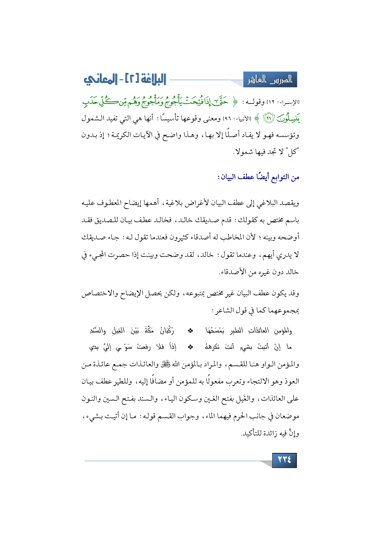 ويقصد البلاغي إلى عطف البيان لأغراض بلاغية، أهمها إيضاح المعطوف عليه باسم مختص به كقولك: قدم صديقك خالد، فخالد عطف بيان للصديق فقد أوضحه وبينه؛ لأن المخاطب له أصدقاء كثيرون فعندما تقول له: جاء صديقك لا يدري أيهم، وعندما تقول: خالد، لقد وضحت وبينت إذا حصرت المجيء في خالد دون غيره من الأصدقاء.