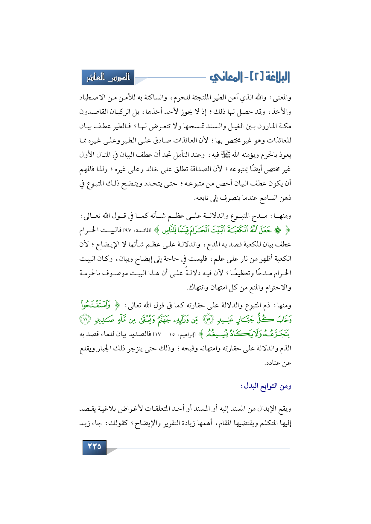 ومنها: مدح المتبوع والدلالة على عظم شأنه كما في قول الله تعالى: {جَعَلَ اللَّهُ الْكَعْبَةَ الْبَيْتَ الْحَرَامَ قِيَامًا لِلنَّاسِ} (المائدة: 97) فالبيت الحرام عطف بيان للكعبة قصد به المدح والدلالة على عظم شأنها لا الإيضاح؛ لأن الكعبة أظهر من نار على علم، فليست في حاجة إلى إيضاح وبيان، وكان البيت الحرام مدحًا وتعظيمًا؛ لأن فيه دلالةً على أن هذا البيت موصوف بالحرمة والاحترام والمنع من كل امتهان وانتهاك.