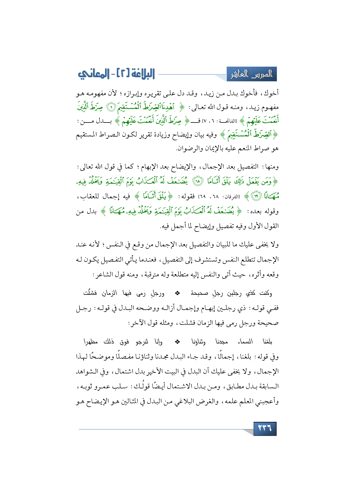 وفي قوله: بلغنا، إجمالًا، وقد جاء البدل مجدنا وثناؤنا مفصلًا وموضحًا لهذا الإجمال، ولا يخفى عليك أن البدل في البيت الأخير بدل اشتمال، وفي الشواهد السابقة بدل مطابق، ومن بدل الاشتمال أيضًا قولُك: سلب عمرو ثوبه، وأعجبني المعلم علمه، والغرض البلاغي من البدل في المثالين هو الإيضاح هو