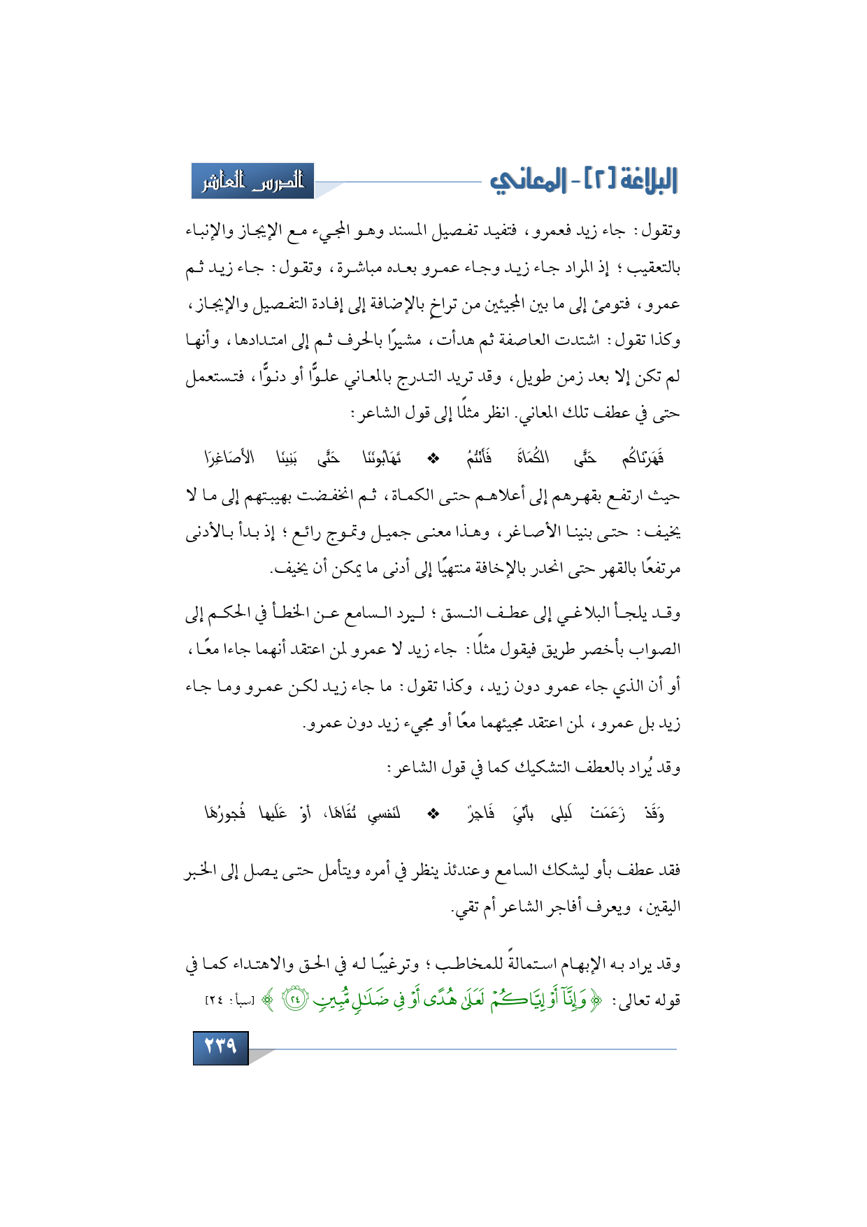 وتقول: جاء زيد فعمرو، فتفيد تفصيل المسند وهو المجيء مع الإيجاز والإنباء بالتعقيب؛ إذ المراد جاء زيد وجاء عمرو بعده مباشرة، وتقول: جاء زيد ثم عمرو، فتومئ إلى ما بين المجيئين من تراخ بالإضافة إلى إفادة التفصيل والإيجاز، وكذا تقول: اشتدت العاصفة ثم هدأت، مشيرًا بالحرف ثم إلى امتدادها، وأنها لم تكن إلا بعد زمن طويل، وقد تريد التدرج بالمعاني علوًّا أو دنوًّا، فتستعمل حتى في عطف تلك المعاني. انظر مثلًا إلى قول الشاعر:
