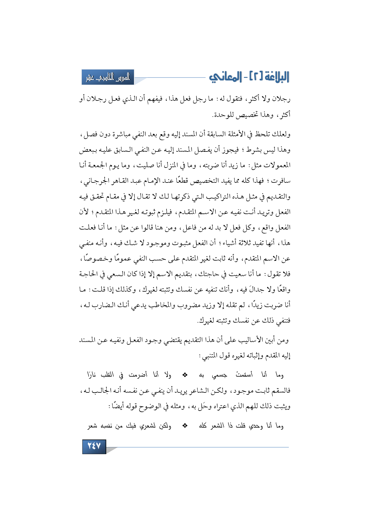 ولعلك تلحظ في الأمثلة السابقة أن المسند إليه وقع بعد النفي مباشرة دون فصل، وهذا ليس بشرط؛ فيجوز أن يفصل المسند إليه عن النفي السابق عليه ببعض المعمولات مثل: ما زيد أنا ضربته، وما في المنزل أنا صليت، وما يوم الجمعة أنا سافرت؛ فهذا كله مما يفيد التخصيص قطعًا عند الإمام عبد القاهر الجرجاني، والتقديم في مثل هذه التراكيب التي ذكرتها لك لا تقال إلا في مقام تحقق فيه الفعل وتريد أنت نفيه عن الاسم المتقدم، فيلزم ثبوته لغير هذا المتقدم؛ لأن الفعل واقع، وكل فعل لا بد له من فاعل، ومن هنا قالوا عن مثل: ما أنا فعلت هذا، أنها تفيد ثلاثة أشياء؛ أن الفعل مثبوت وموجود لا شك فيه، وأنه منفي عن الاسم المتقدم، وأنه ثابت لغير المتقدم على حسب النفي عمومًا وخصوصًا، فلا تقول: ما أنا سعيت في حاجتك، بتقديم الاسم إلا إذا كان السعي في الحاجة واقعًا ولا جدالَ فيه، وأنك تنفيه عن نفسك وتثبته لغيرك، وكذلك إذا قلت: ما أنا ضربت زيدًا، لم تقله إلا وزيد مضروب والمخاطب يدعي أنك الضارب له، فتنفي ذلك عن نفسك وتثبته لغيرك.