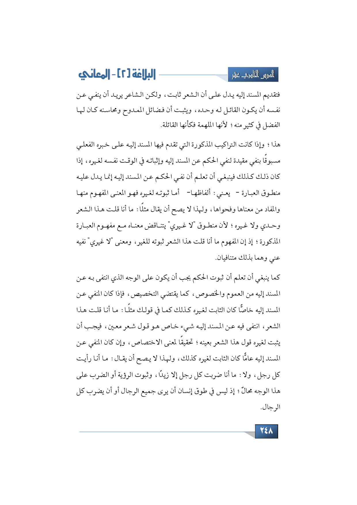كما ينبغي أن تعلم أن ثبوت الحكم يجب أن يكون على الوجه الذي انتفى به عن المسند إليه من العموم والخصوص، كما يقتضي التخصيص، فإذا كان المنفي عن المسند إليه خاصًّا كان الثابت لغيره كذلك كما في قولك مثلًا: ما أنا قلت هذا الشعر، انتفى فيه عن المسند إليه شيء خاص هو قول شعر معين، فيجب أن يثبت لغيره قول هذا الشعر بعينه؛ تحقيقًا لمعنى الاختصاص، وإن كان المنفي عن المنسد إليه عامًّا كان الثابت لغيره كذلك، ولهذا لا يصح أن يقال: ما أنا رأيت كل رجل، ولا: ما أنا ضربت كل رجل إلا زيدًا، وثبوت الرؤية أو الضرب على هذا الوجه محالٌ؛ إذ ليس في طوق إنسان أن يرى جميع الرجال أو أن يضرب كل الرجال.