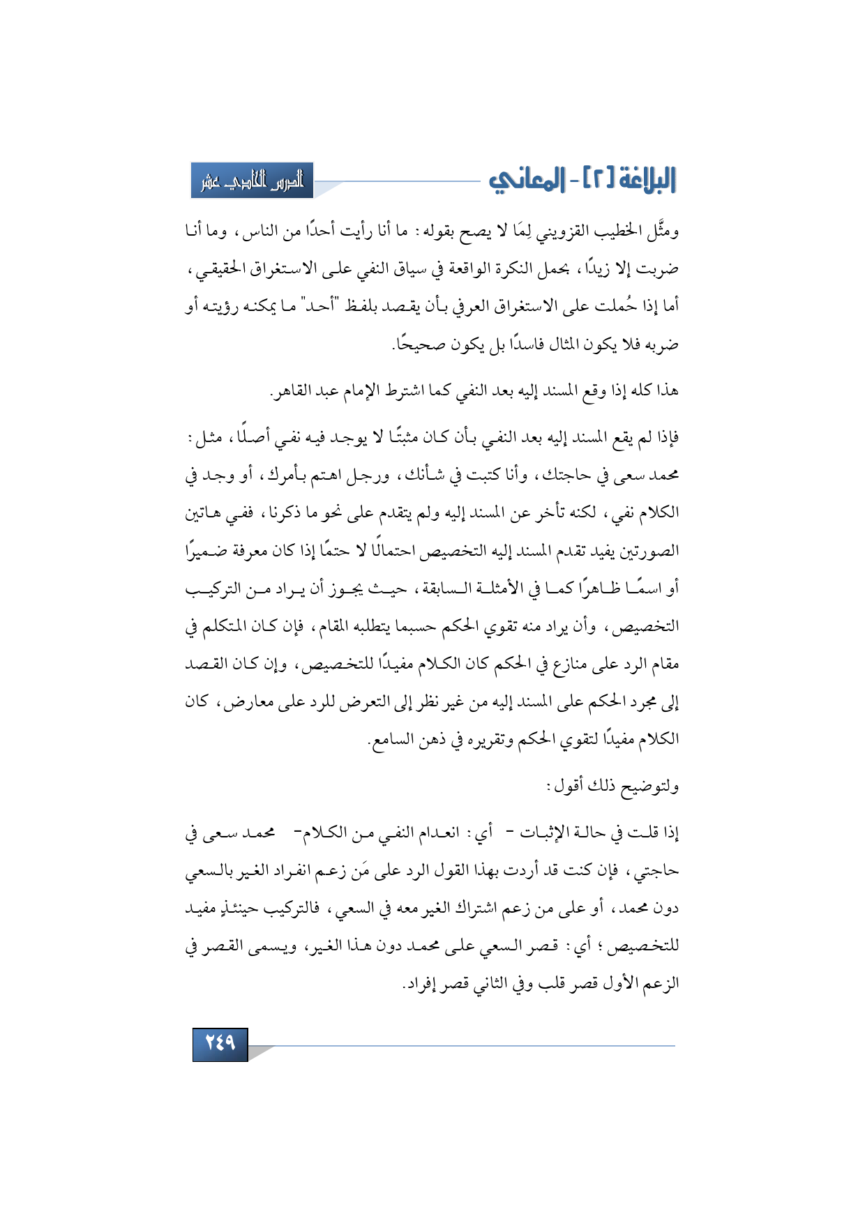 فإذا لم يقع المسند إليه بعد النفي بأن كان مثبتًا لا يوجد فيه نفي أصلًا، مثل: محمد سعى في حاجتك، وأنا كتبت في شأنك، ورجل اهتم بأمرك، أو وجد في الكلام نفي، لكنه تأخر عن المسند إليه ولم يتقدم على نحو ما ذكرنا، ففي هاتين الصورتين يفيد تقدم المسند إليه التخصيص احتمالًا لا حتمًا إذا كان معرفة ضميرًا أو اسمًا ظاهرًا كما في الأمثلة السابقة، حيث يجوز أن يراد من التركيب التخصيص، وأن يراد منه تقوي الحكم حسبما يتطلبه المقام، فإن كان المتكلم في مقام الرد على منازع في الحكم كان الكلام مفيدًا للتخصيص، وإن كان القصد إلى مجرد الحكم على المسند إليه من غير نظر إلى التعرض للرد على معارض، كان الكلام مفيدًا لتقوي الحكم وتقريره في ذهن السامع.