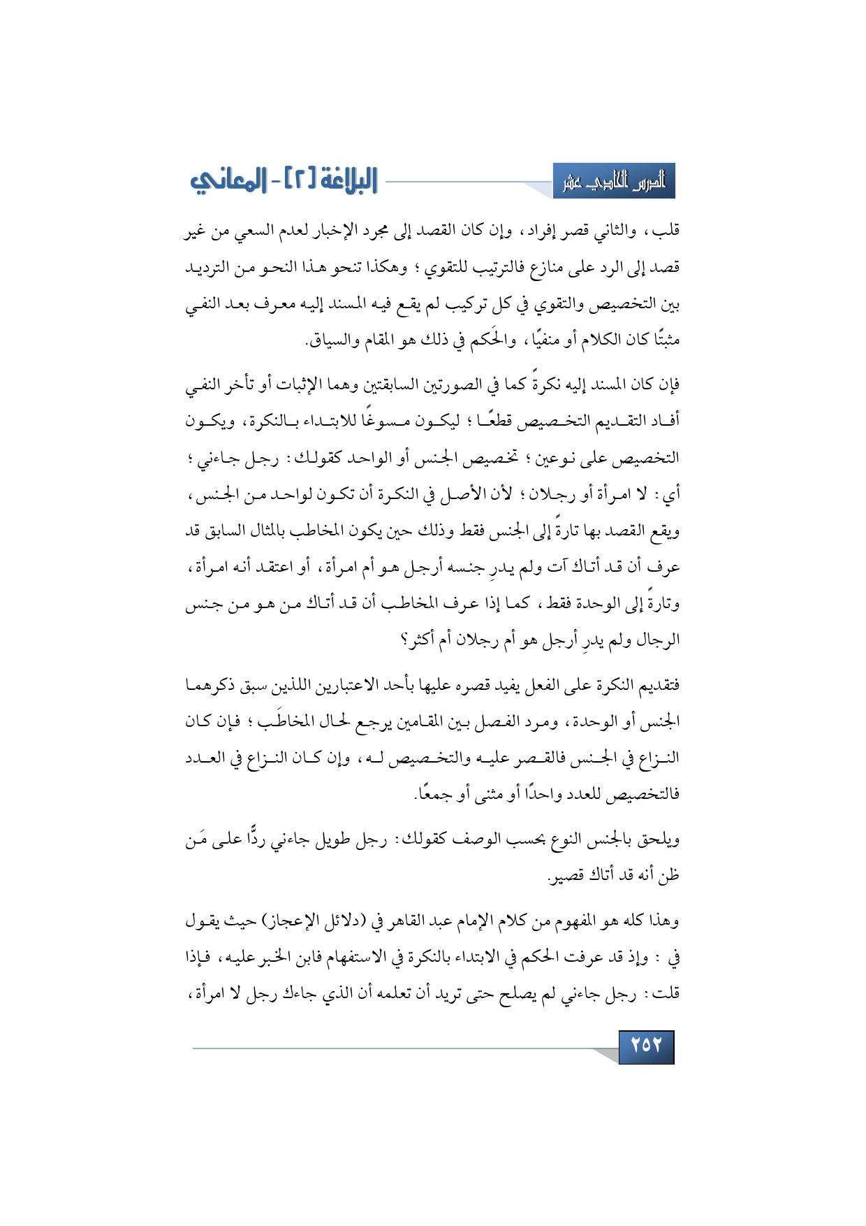 ويلحق بالجنس النوع بحسب الوصف كقولك: رجل طويل جاءني ردًّا على مَن ظن أنه قد أتاك قصير، وهذا كله هو المفهوم من كلام الإمام عبد القاهر في (دلائل الإعجاز) حيث يقول في وإذ قد عرفت الحكم في الابتداء بالنكرة في الاستفهام فابن الخبر عليه، فإذا قلت: رجل جاءني لم يصلح حتى تريد أن تعلمه أن الذي جاءك رجل لا امرأة،