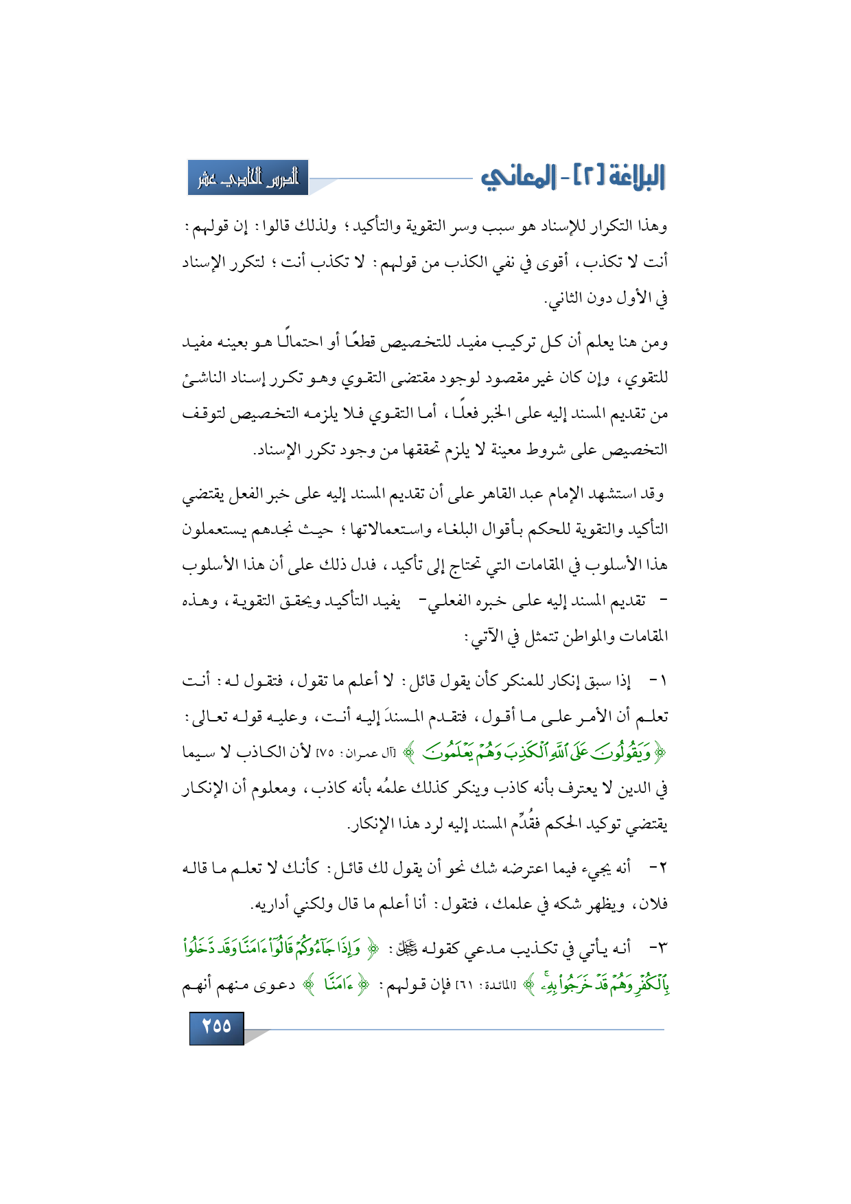 ومن هنا يعلم أن كل تركيب مفيد للتخصيص قطعًا أو احتمالًا هو بعينه مفيد للتقوي، وإن كان غير مقصود لوجود مقتضى التقوي وهو تكرر إسناد الناشئ من تقديم المسند إليه على الخبر فعلًا، أما التقوي فلا يلزمه التخصيص لتوقف التخصيص على شروط معينة لا يلزم تحققها من وجود تكرر الإسناد.