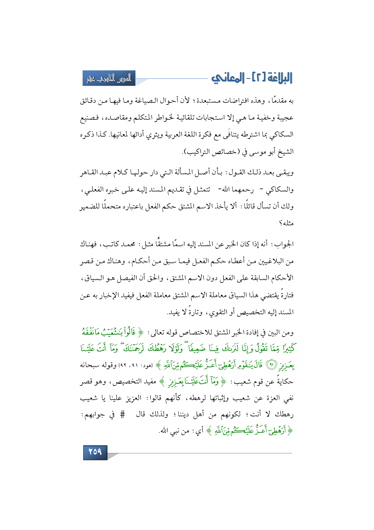 الجواب: أنه إذا كان الخبر عن المسند إليه اسمًا مشتقًّا مثل: محمد كاتب، فهناك من البلاغيين من أعطاه حكم الفعل فيما سبق من أحكام، وهناك من قصر الأحكام السابقة على الفعل دون الاسم المشتق، والحق أن الفيصل هو السياق، فتارةً يقتضي هذا السياق معاملة الاسم المشتق معاملة الفعل فيفيد الإخبار به عن المسند إليه التخصيص أو التقوي، وتارةً لا يفيد، ومن البين في إفادة الخبر المشتق للاختصاص قوله تعالى: {قَالُوا يَا شُعَيْبُ مَا نَفْقَهُ كَثِيرًا مِمَّا تَقُولُ وَإِنَّا لَنَرَاكَ فِينَا ضَعِيفًا وَلَوْلَا رَهْطُكَ لَرَجَمْنَاكَ وَمَا أَنْتَ عَلَيْنَا بِعَزِيزٍ * قَالَ يَا قَوْم أَرَهْطِي أَعَزُّ عَلَيْكُمْ مِنَ اللَّهِ} (هود: 91، 92) وقوله سبحانه حكايةً عن قوم شعيب: {وَمَا أَنْتَ عَلَيْنَا بِعَزِيزٍ} مفيد التخصيص، وهو قصر نفي العزة عن شعيب وإثباتها لرهطه، كأنهم قالوا: العزيز علينا يا شعيب رهطك لا أنت؛ لكونهم من أهل ديننا؛ ولذلك قال - عليه السلام - في جوابهم: {أَرَهْطِي أَعَزُّ عَلَيْكُمْ مِنَ اللَّهِ} أي: من نبي الله.
