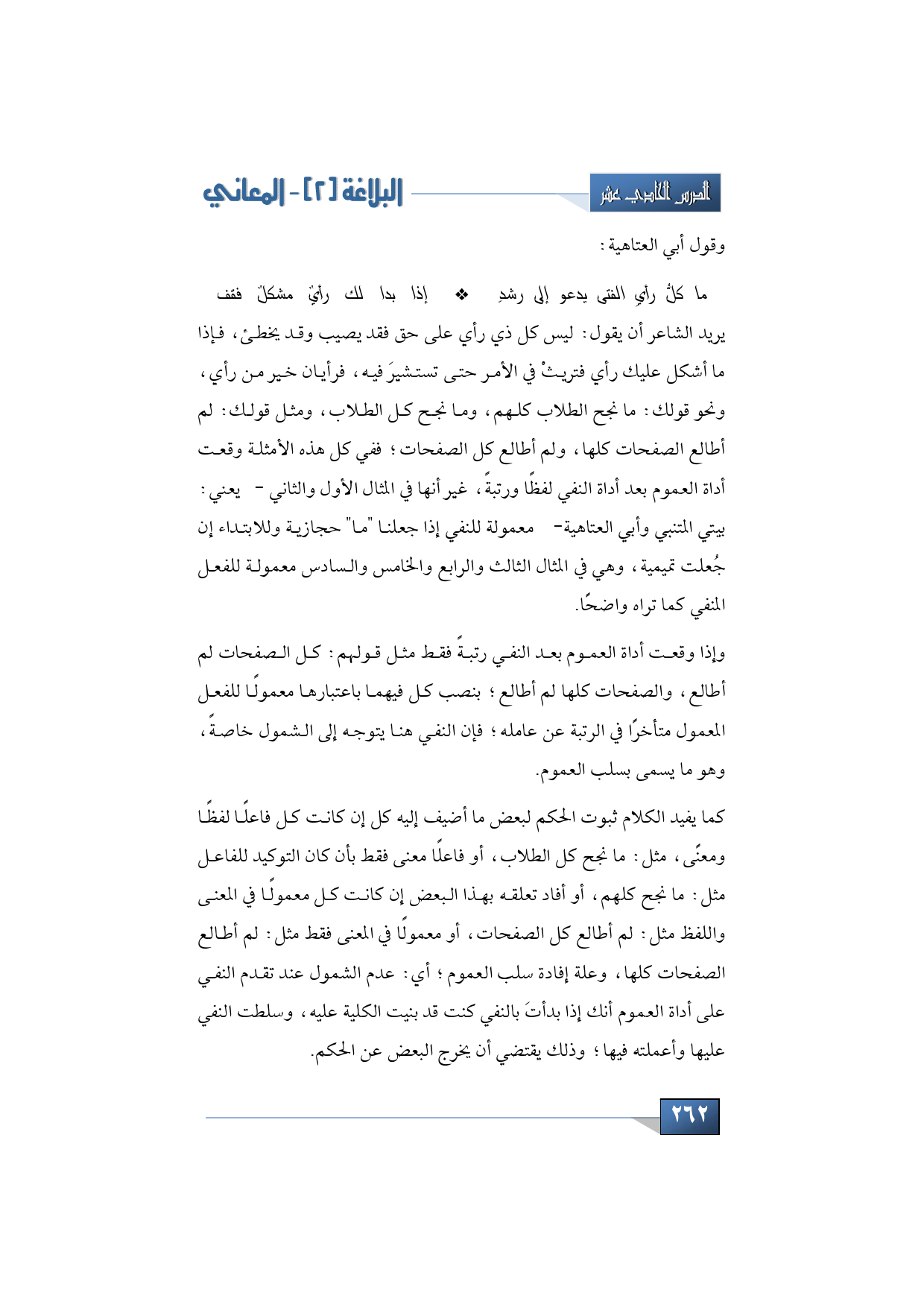 يريد الشاعر أن يقول: ليس كل ذي رأي على حق فقد يصيب وقد يخطئ، فإذا ما أشكل عليك رأي فتريثْ في الأمر حتى تستشيرَ فيه، فرأيان خير من رأي، ونحو قولك: ما نجح الطلاب كلهم، وما نجح كل الطلاب، ومثل قولك: لم أطالع الصفحات كلها، ولم أطالع كل الصفحات؛ ففي كل هذه الأمثلة وقعت أداة العموم بعد أداة النفي لفظًا ورتبة ً، غير أنها في المثال الأول والثاني -يعني: بيتي المتنبي وأبي العتاهية- معمولة للنفي إذا جعلنا "ما" حجازية وللابتداء إن جعلت تميمية، وهي في المثال الثالث والرابع والخامس والسادس معمولة للفعل المنفي كما تراه واضحًا.