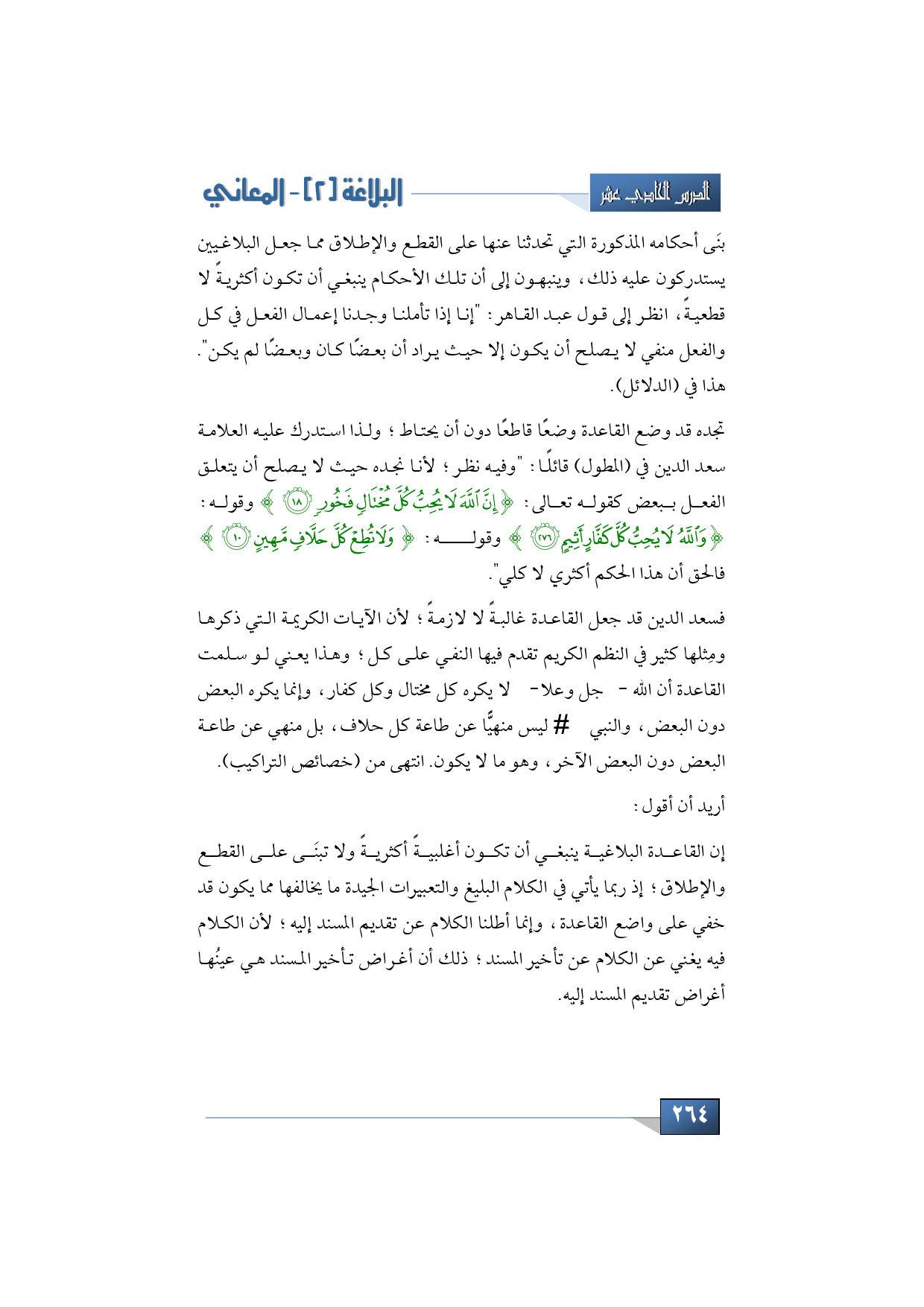 فسعد الدين قد جعل القاعدة غالبةً لا لازمةً؛ لأن الآيات الكريمة التي ذكرها ومِثلها كثير في النظم الكريم تقدم فيها النفي على كل؛ وهذا يعني لو سلمت القاعدة أن الله -جل وعلا- لا يكره كل مختال وكل كفار، وإنما يكره البعض دون البعض، والنبي - عليه السلام - ليس منهيًّا عن طاعة كل حلاف، بل منهي عن طاعة البعض دون البعض الآخر، وهو ما لا يكون.