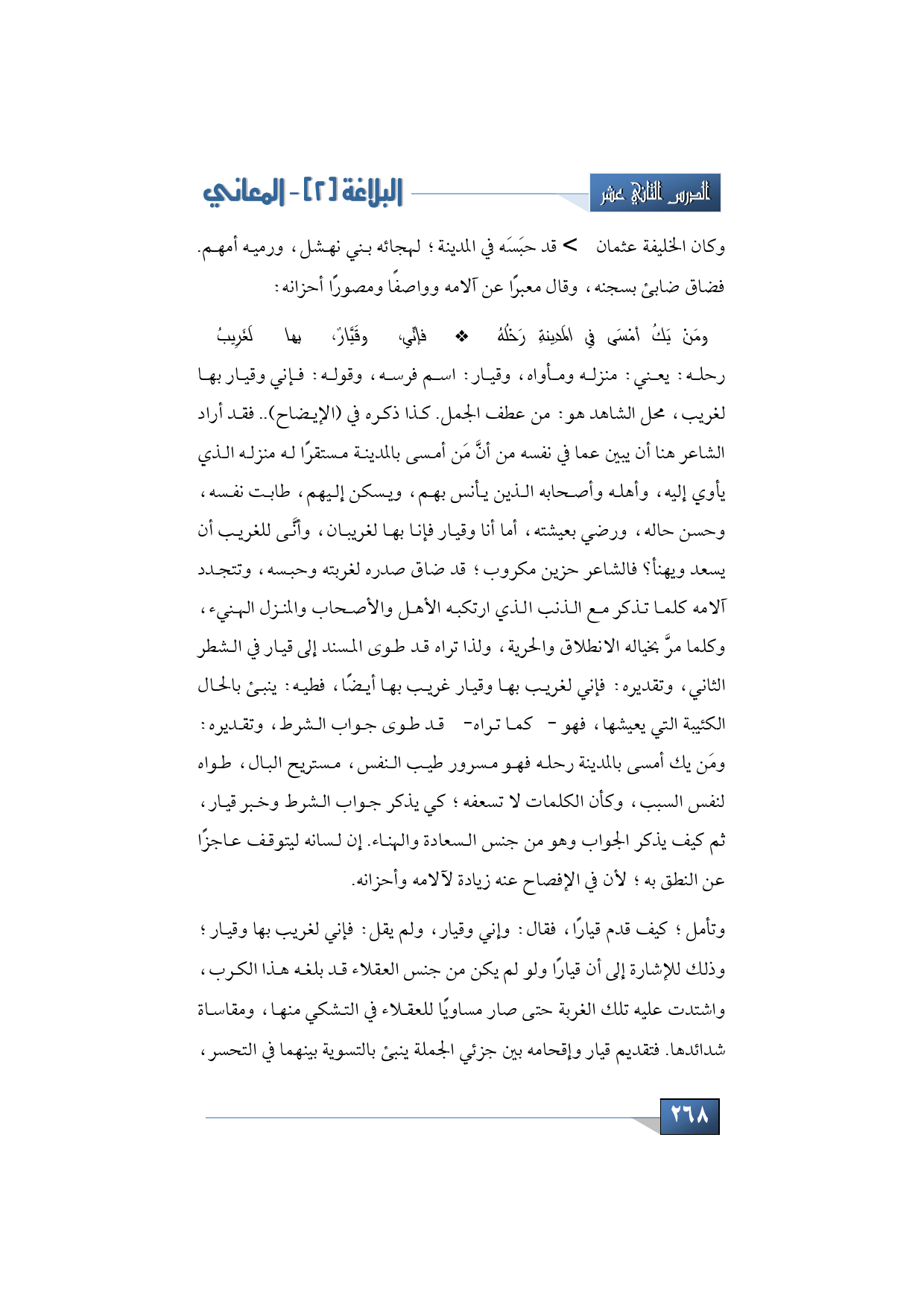 رحله: يعني: منزله ومأواه، وقيار: اسم فرسه، وقوله: فإني وقيار بها لغريب، محل الشاهد هو: من عطف الجمل. كذا ذكره في (الإيضاح). فقد أراد الشاعر هنا أن يبين عما في نفسه من أن من أمسى بالمدينة مستقرًا له منزله الذي يأوي إليه، وأهله وأصحابه الذين يأنس بهم، ويسكن إليهم، طابت نفسه، وحسن حاله، ورضي بعيشته، أما أنا وقيار فإنا بها لغريبان، وأنَّى للغريب أن يسعد ويهنأ، فالشاعر حزين مكروب؛ قد ضاق صدره لغربته وحبسه، وتتجدد آلامه كلما تذكر مع الذنب الذي ارتكبه الأهل والأصحاب والمنزل الهنيء، وكلما مر بخياله الانطلاق والحرية، ولذا تراه قد طوى المسند إلى قيار في الشطر الثاني، وتقديره: فإني لغريب بها وقيار، غريب بها أيضًا، فطيه: ينبئ بالحال الكئيبة التي يعيشها، فهو -كما تراه- قد طوى جواب الشرط، وتقديره: ومَن يك أمسى بالمدينة رحله فهو مسرور طيب النفس، مستريح البال، طواه لنفس السبب، وكأن الكلمات لا تسعفه؛ كي يذكر جواب الشرط وخبر قيار، ثم كيف يذكر الجواب وهو من جنس السعادة والهناء. إن لسانه ليتوقف عاجزًا عن النطق به؛ لأن في الإفصاح عنه زيادة لآلامه وأحزانه.