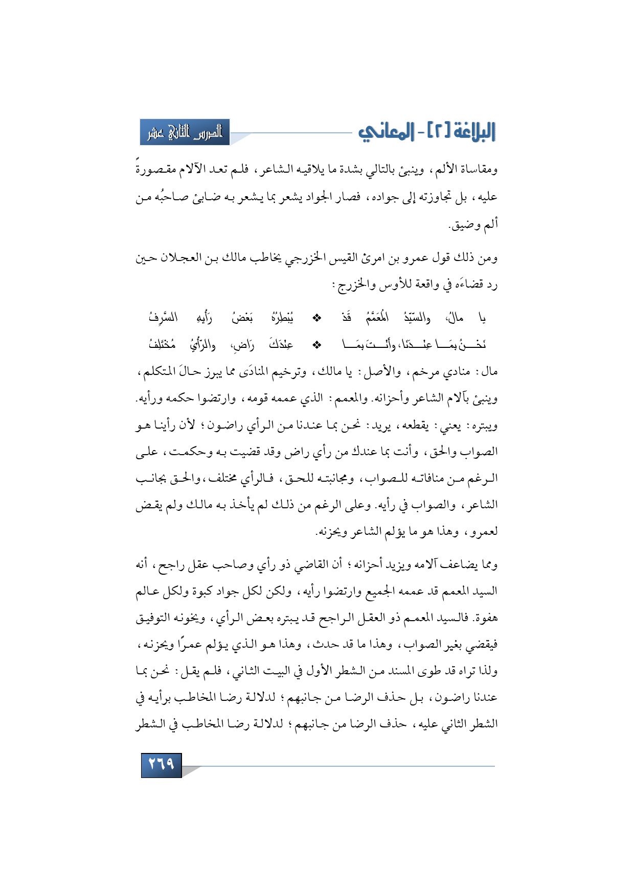 مال: منادي مرخم، والأصل: يا مالك، وترخيم المنادَى مما يبرز حالَ المتكلم، وينبئ بآلام الشاعر وأحزانه. والمعمم: الذي عممه قومه، وارتضوا حكمه ورأيه. ويبتره: يعني: يقطعه، يريد: نحن بما عندنا من الرأي راضون؛ لأن رأينا هو الصواب والحق، وأنت بما عندك من رأي راض وقد قضيت به وحكمت، على الرغم من منافاته للصواب، ومجانبته للحق، فالرأي مختلف، والحق بجانب الشاعر، والصواب في رأيه. وعلى الرغم من ذلك لم يأخذ به مالك ولم يقض لعمرو، وهذا هو ما يؤلم الشاعر ويحزنه.
