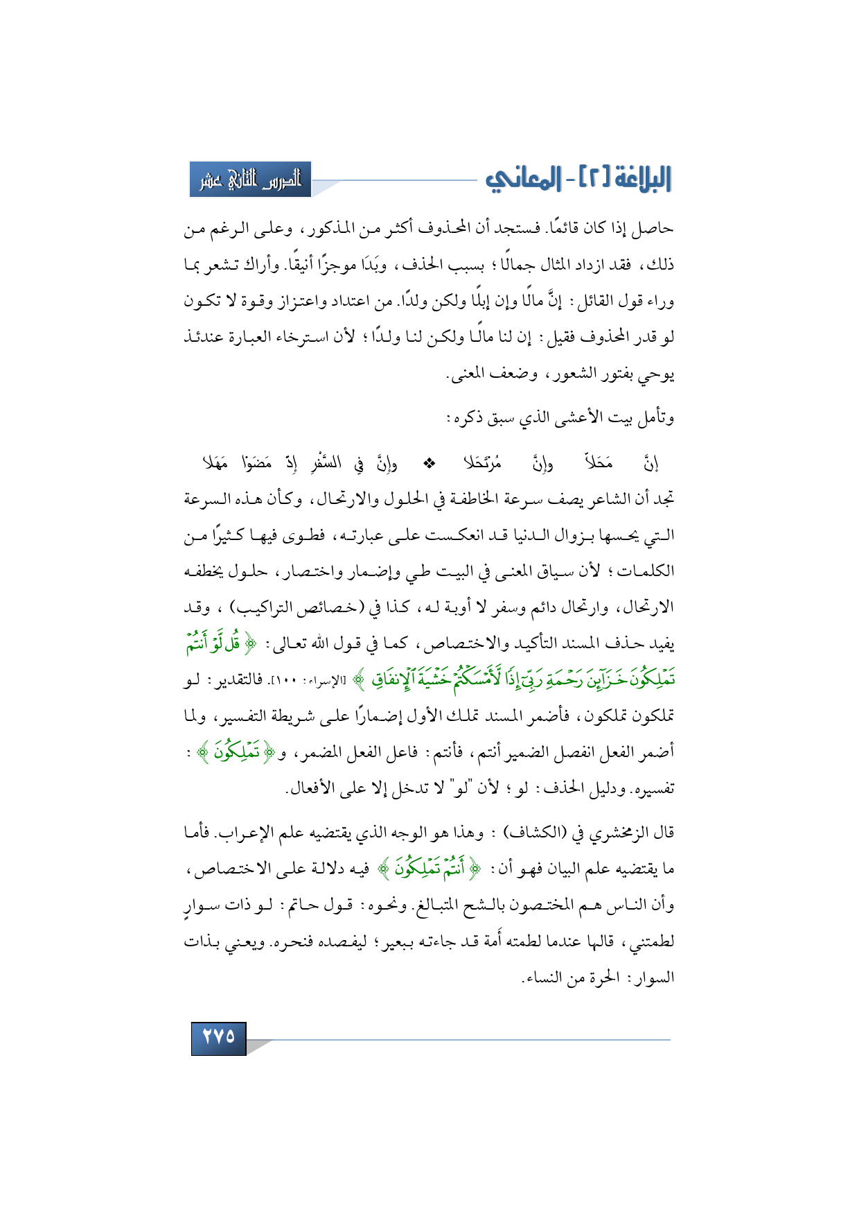 تجد أن الشاعر يصف سرعة الخاطفة في الحلول والارتحال، وكأن هذه السرعة التي يحسها بزوال الدنيا قد انعكست على عبارته، فطوى فيها كثيرا من الكلمات؛ لأن سياق المعنى في البيت طي وإضمار واختصار، حلول يخطفه الارتحال، وارتحال دائم وسفر لا أوبة له، كذا في (خصائص التراكيب)، وقد يفيد حذف المسند التأكيد والاختصاص، كما في قول الله تعالى: {قُلْ لَوْ أَنْتُمْ تَمْلِكُونَ خَزَائِنَ رَحْمَةِ رَبِّي إِذًا لَأَمْسَكْتُمْ خَشْيَةَ الْإِنْفَاقِ} (الإسراء: 100). فالتقدير: لو تملكون تملكون، فأضمر المسند تملك الأول إضمارًا على شريطة التفسير، ولما أضمر الفعل انفصل الضمير أنتم، فأنتم: فاعل الفعل المضمر، و {تَمْلِكُونَ}: تفسيره. ودليل الحذف: لو؛ لأن "لو" لا تدخل إلا على الأفعال.