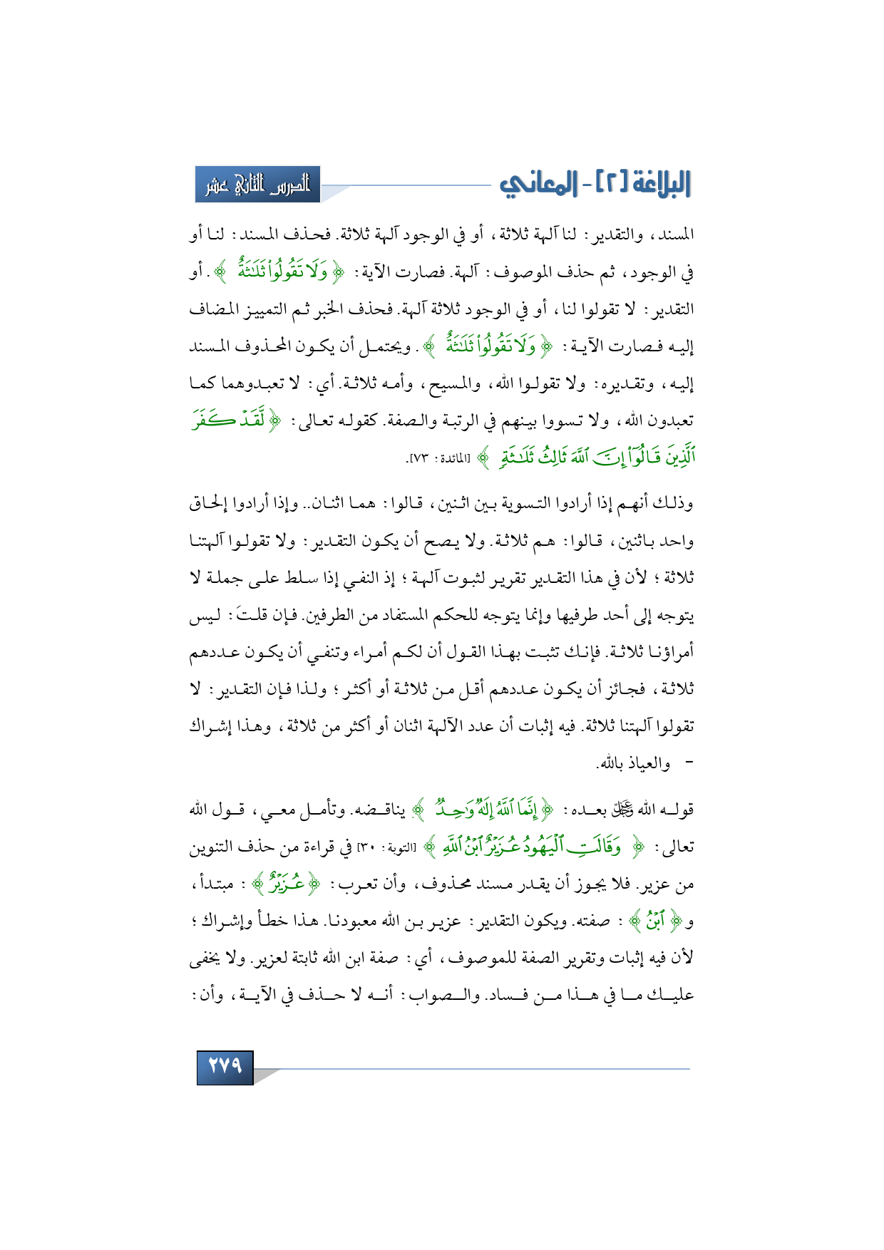 المسند، والتقدير: لنا آلهة ثلاثة، أو في الوجود آلهة ثلاثة. فحذف المسند: لنا أو في الوجود، ثم حذف الموصوف: آلهة. فصارت الآية: {لَا تَقُولُوا ثَلَاثَةٌ}. أو التقدير: لا تقولوا لنا، أو في الوجود ثلاثة آلهة. فحذف الخبر ثم التمييز المضاف إليه فصارت الآية: {لَا تَقُولُوا ثَلَاثَةٌ}. ويحتمل أن يكون المحذوف المسند إليه، وتقديره: ولا تقولوا الله، والمسيح، وأمه ثلاثة. أي: لا تعبدوهما كما تعبدون الله، ولا تسووا بينهم في الرتبة والصفة. كقوله تعالى: {لَقَدْ كَفَرَ الَّذِينَ قَالُوا إِنَّ اللَّهَ ثَالِثُ ثَلَاثَةٍ} (المائدة: 73).