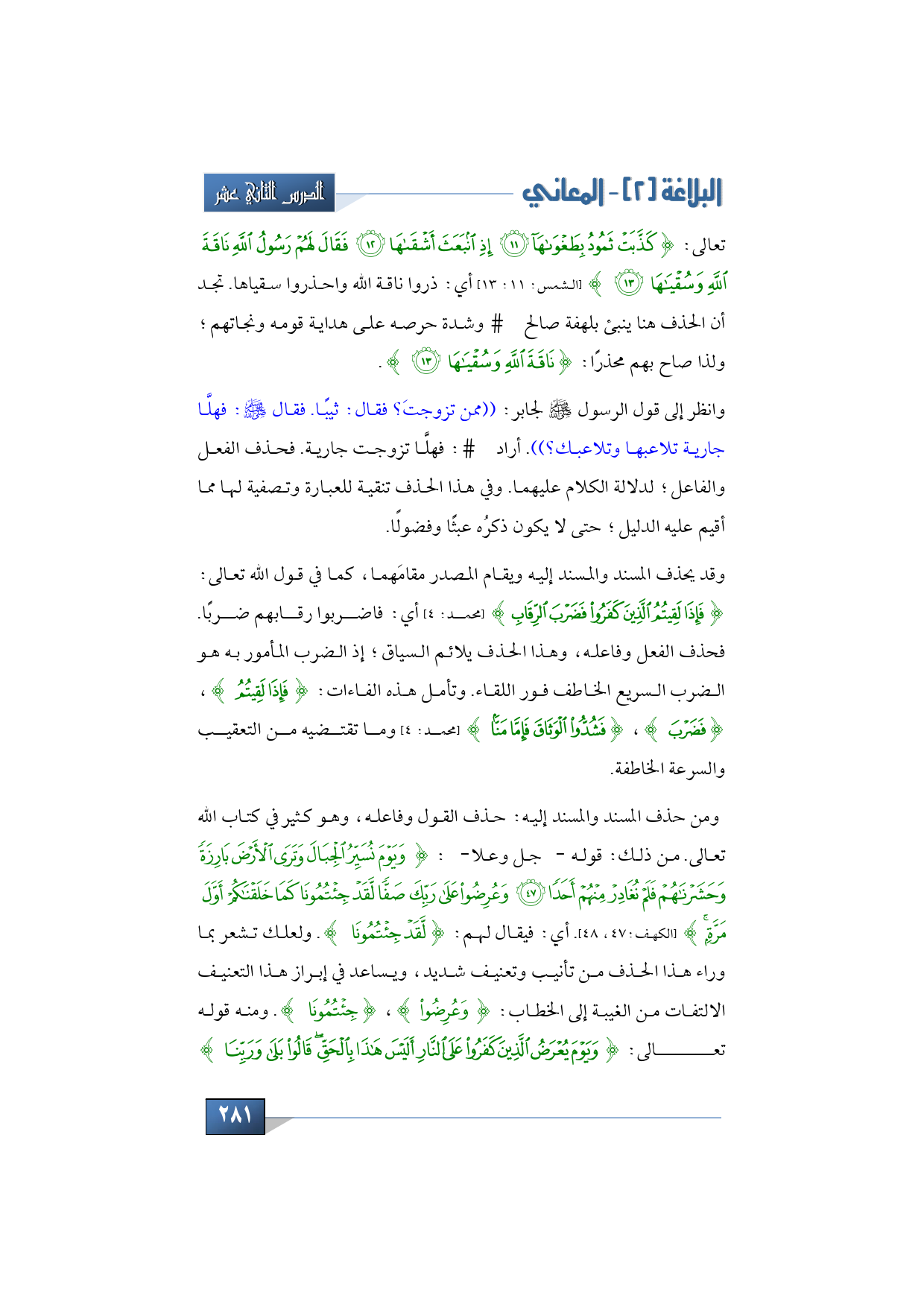 تعالى: {كَذَّبَتْ ثَمُودُ بِطَغْوَاهَا * إِذِ انْبَعَثَ أَشْقَاهَا * فَقَالَ لَهُمْ رَسُولُ اللَّهِ نَاقَةَ اللَّهِ وَسُقْيَاهَا} (الشمس: 11: 13) أي: ذروا ناقة الله واحذروا سقياها. تجد أن الحذف هنا ينبئ بلهفة صالح -عليه السلام- وشدة حرصه على هداية قومه ونجاتهم؛ ولذا صاح بهم محذرًا: {نَاقَةَ اللَّهِ وَسُقْيَاهَا}.