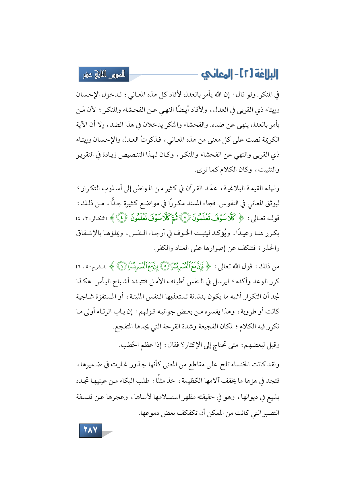 من ذلك: قول الله تعالى: {فَإِنَّ مَعَ الْعُسْرِ يُسْرًا * إِنَّ مَعَ الْعُسْرِ يُسْرًا} (الشرح:5، 6) كرر الوعد وأكده؛ ليرسل في النفس أطياف الأمل فتتبدد أشباح اليأس. هكذا نجد أن التكرار أشبه ما يكون بدندنة تستعذبها النفس المليئة، أو المستفزة شاجية كانت أو طروبة، وهذا يفسره من بعض جوانبه قولهم: إن باب الرثاء أولى ما تكرر فيه الكلام؛ لمكان الفجيعة وشدة القرحة التي يجدها المتفجع. وقيل لبعضهم: متى تحتاج إلى الإكثار؟ فقال: إذا عظم الخطب.