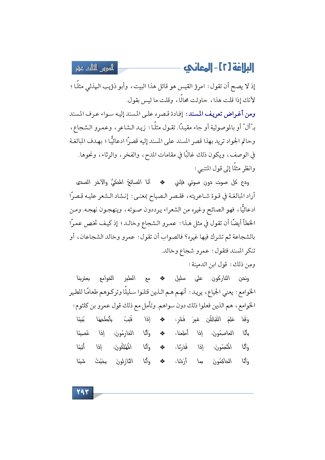 أراد المبالغة في قوة شاعريته، فقصر الصياح بمعنى: إنشاد الشعر عليه قصرًا ادعائيًّا، فهو الصائح وغيره من الشعراء يرددون صوته، وينهجون نهجه. ومن الخطأ أيضًا أن تقول في مثل هذا: عمرو الشجاع وخالد. إذ كيف تخص عمرًا بالشجاعة ثم تشرك فيها غيره؟ فالصواب أن تقول: عمرو وخالد الشجاعان، أو تنكر المسند فتقول: عمرو شجاع وخالد.