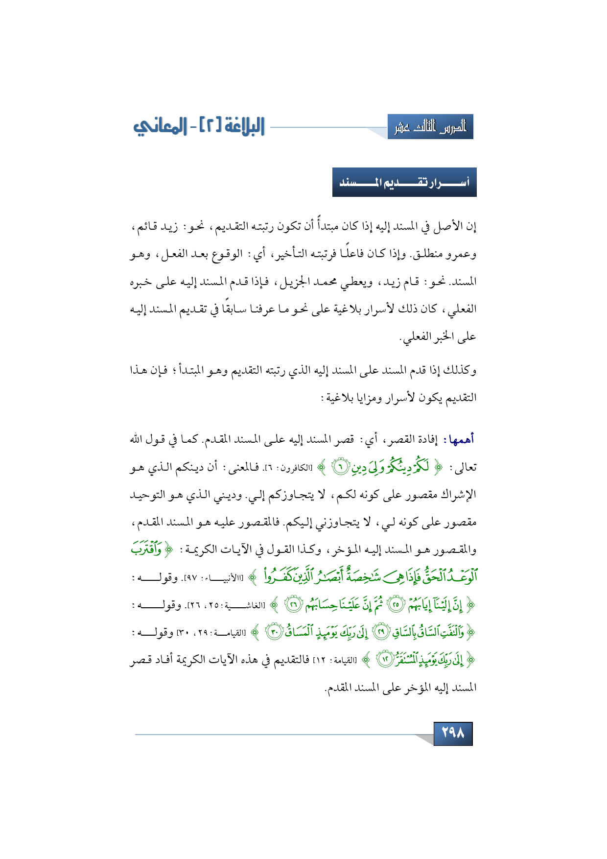 وكذلك إذا قدم المسند على المسند إليه الذي رتبته التقديم وهو المبتدأ؛ فإن هذا التقديم يكون لأسرار ومزايا بلاغية. أهمها: إفادة القصر، أي: قصر المسند إليه على المسند المقدم. كما في قول الله تعالى: {لَكُمْ دِينُكُمْ وَلِيَ دِينِ} (الكافرون: 6). فالمعنى: أن دينكم الذي هو الإشراك مقصور على كونه لكم، لا يتجاوزكم إلي. وديني الذي هو التوحيد مقصور على كونه لي، لا يتجاوزني إليكم. فالمقصور عليه هو المسند المقدم، والمقصور هو المسند إليه المؤخر، وكذا القول في الآيات الكريمة: {وَاقْتَرَبَ الْوَعْدُ الْحَقُّ فَإِذَا هِيَ شَاخِصَةٌ أَبْصَارُ الَّذِينَ كَفَرُوا} (االأنبياء: 97). وقوله: {إِنَّ إِلَيْنَا إِيَابَهُمْ * ثُمَّ إِنَّ عَلَيْنَا حِسَابَهُمْ} (الغاشية:25، 26). وقوله: {وَالْتَفَّتِ السَّاقُ بِالسَّاقِ * إِلَى رَبِّكَ يَوْمَئِذٍ الْمَسَاقُ} (القيامة:29، 30). وقوله: {إِلَى رَبِّكَ يَوْمَئِذٍ الْمُسْتَقَرُّ} (القيامة: 12).