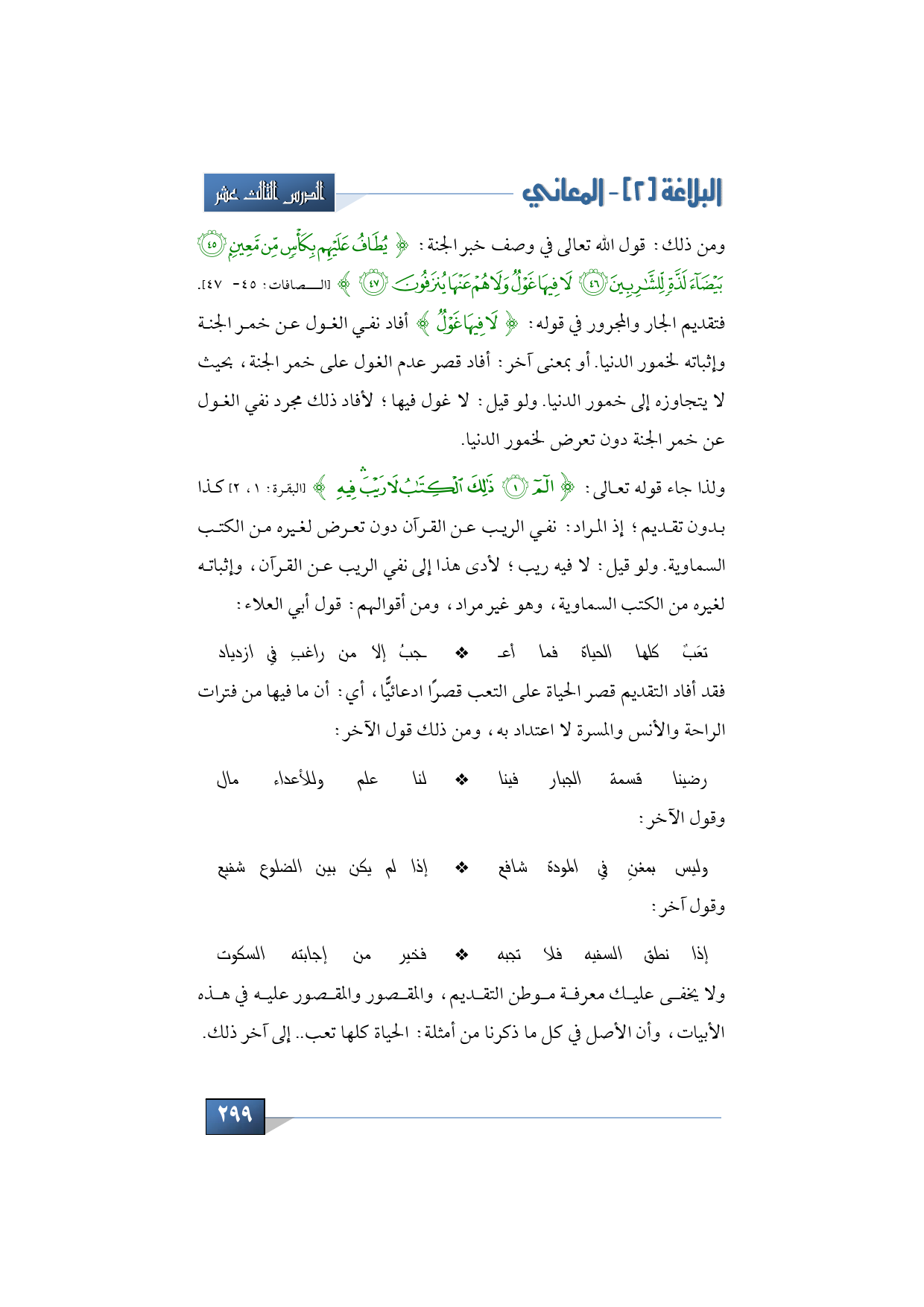 ولذا جاء قوله تعالى: {الم * ذَلِكَ الْكِتَابُ لَا رَيْبَ فِيهِ} (البقرة: 1، 2). كذا بدون تقديم، إذ المراد: نفي الريب عن القرآن دون تعرض لغيره من الكتب السماوية. ولو قيل: لا فيه ريب؛ لأدى هذا إلى في الريب عن القرآن، وإثباته لغيره من الكتب السماوية، وهو غير مراد، ومن أقوالهم: قول أبي العلاء: