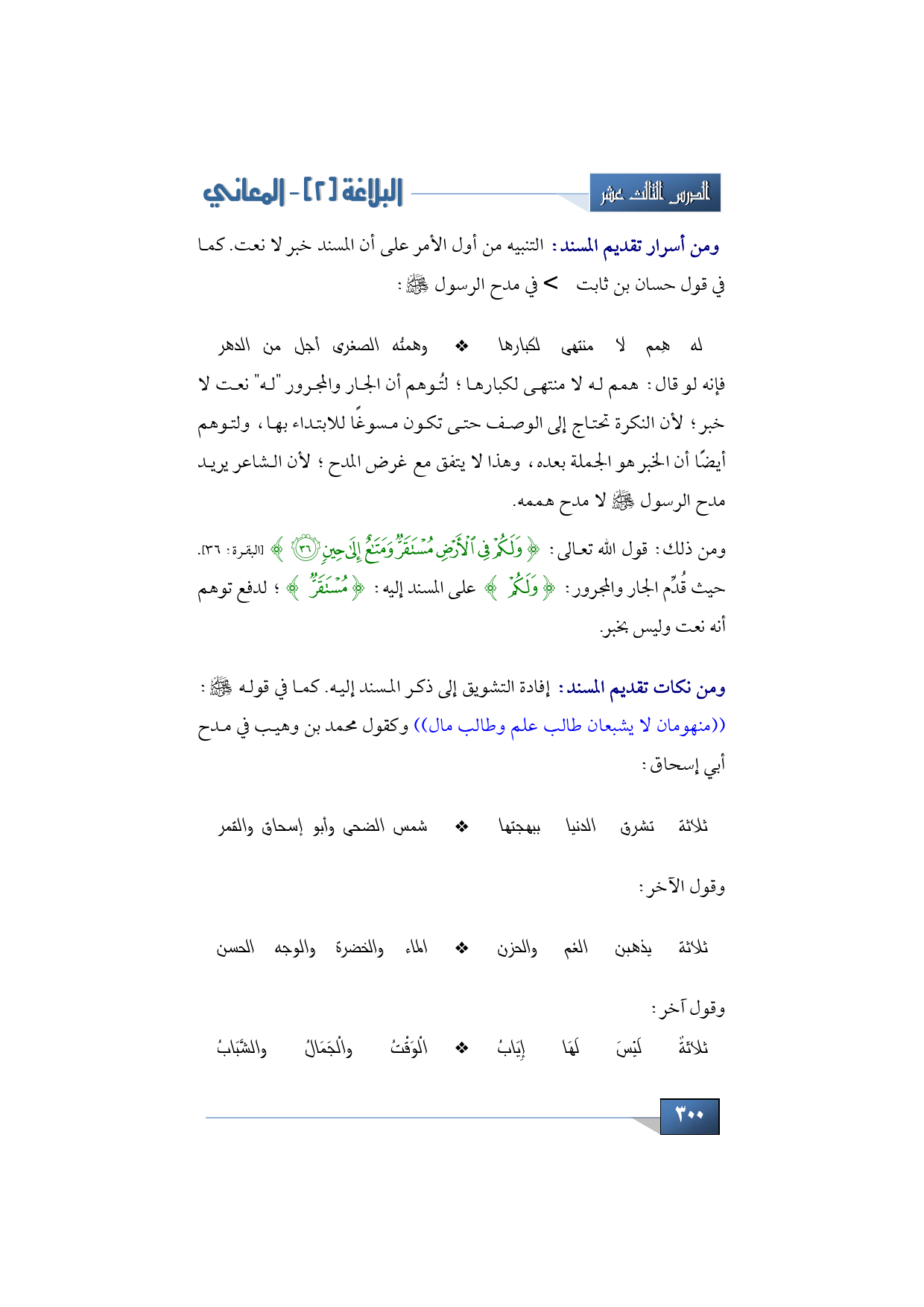 ومن أسرار تقديم المسند ونكاته البلاغية: التنبيه من أول الأمر على أن المسند خبر لا نعت. كما في قول حسان بن ثابت -رضي الله عنه- في مدح الرسول -صلى الله عليه وسلم-: