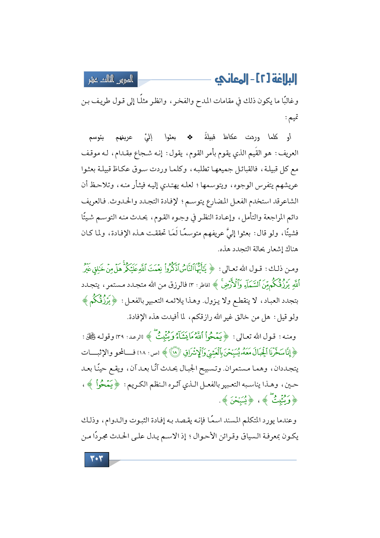 ومنه: قول الله تعالى: {يَمْحُو اللَّهُ مَا يَشَاءُ وَيُثْبِتُ} (الرعد: 39). وقوله -عز وجل-: {إِنَّا سَخَّرْنَا الْجِبَالَ مَعَهُ يُسَبِّحْنَ بِالْعَشِيِّ وَالْإِشْرَاقِ} (ص: 18). فالمحو والإثبات يتجددان، وهما مستمران. وتسبيح الجبال يحدث آنًا بعد آن، ويقع حينًا بعد حين، وهذا يناسبه التعبير بالفعل الذي آثره النظم الكريم: {يَمْحُو}، {يُثْبِتُ}، {يُسَبِّحْنَ}.