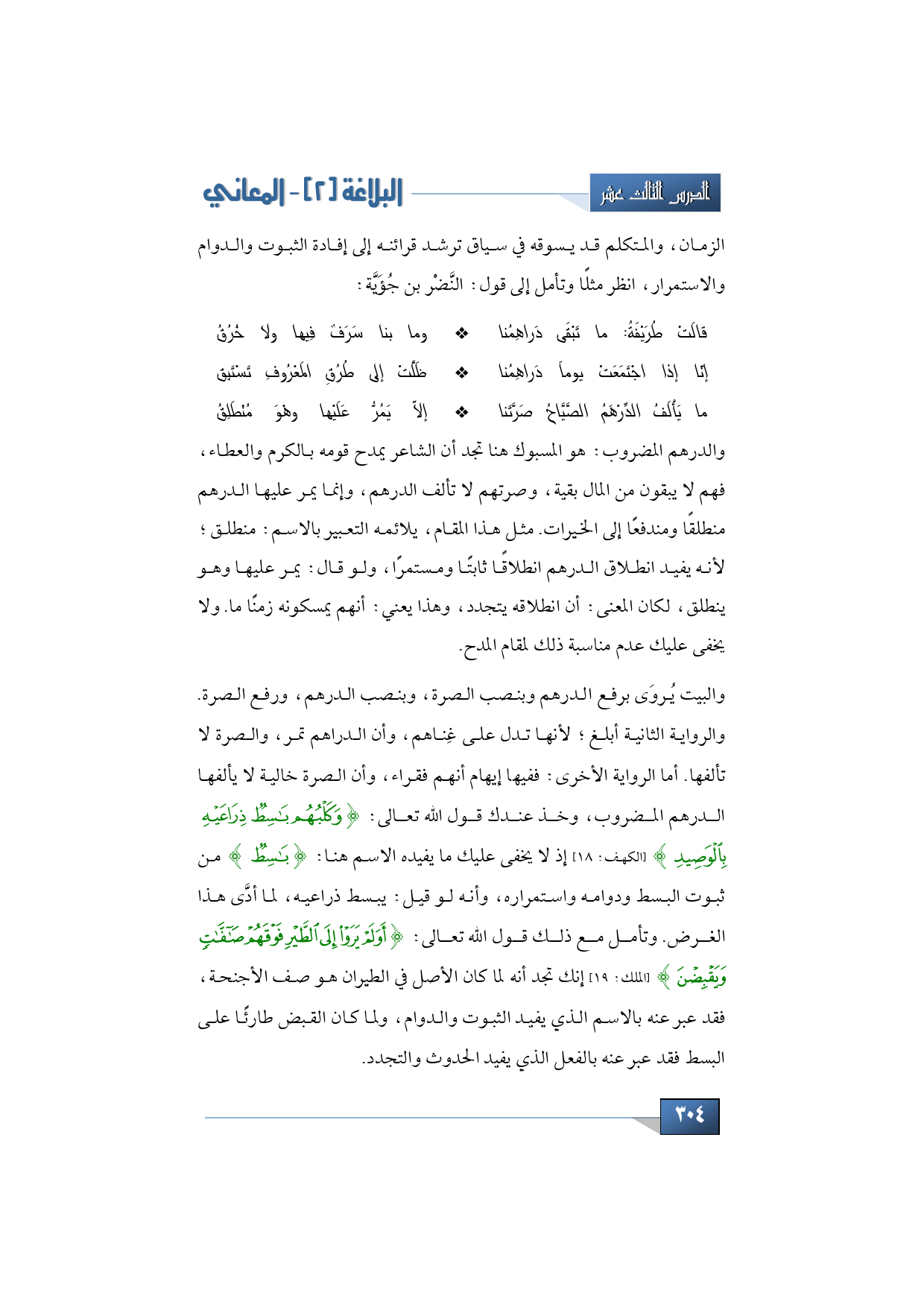 والبيت يروَى برفع الدرهم وبنصب الصرة، وبنصب الدرهم، ورفع الصرة. والرواية الثانية أبلغ؛ لأنها تدل على غِناهم، وأن الدراهم تمر، والصرة لا تألفها. أما الرواية الأخرى: ففيها إيهام أنهم فقراء، وأن الصرة خالية لا يألفها الدرهم المضروب، وخذ عندك قول الله تعالى: {وَكَلْبُهُمْ بَاسِطٌ ذِرَاعَيْهِ بِالْوَصِيدِ} (الكهف: 18) إذ لا يخفى عليك ما يفيده الاسم هنا: {بَاسِطٌ} من ثبوت البسط ودوامه واستمراره، وأنه لو قيل: يبسط ذراعيه، لما أدَّى هذا الغرض. وتأمل مع ذلك قول الله تعالى: {أَوَلَمْ يَرَوْا إِلَى الطَّيْرِ فَوْقَهُمْ صَافَّاتٍ وَيَقْبِضْنَ} (الملك: 19) إنك تجد أنه لما كان الأصل في الطيران هو صف الأجنحة، فقد عبر عنه بالاسم الذي يفيد الثبوت والدوام، ولما كان القبض طارئًا على البسط فقد عبر عنه بالفعل الذي يفيد الحدوث والتجدد.
