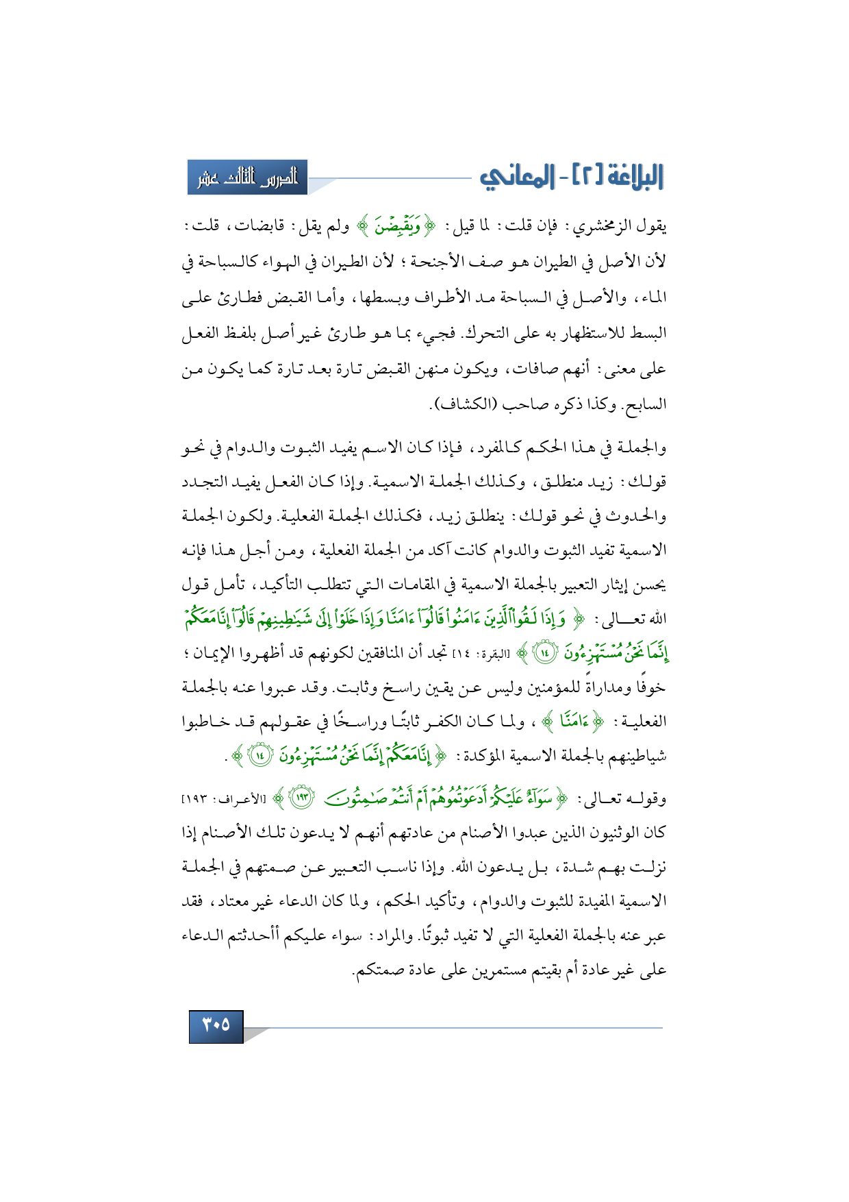 والجملة في هذا الحكم كالمفرد، فإذا كان الاسم يفيد الثبوت والدوام في نحو قولك: زيد منطلق، وكذلك الجملة الاسمية. وإذا كان الفعل يفيد التجدد والحدوث في نحو قولك: ينطلق زيد، فكذلك الجملة الفعلية. ولكون الجملة الاسمية تفيد الثبوت والدوام كانت آكد من الجملة الفعلية، ومن أجل هذا فإنه يحسن إيثار التعبير بالجملة الاسمية في المقامات التي تتطلب التأكيد، تأمل قول الله تعالى: {وَإِذَا لَقُوا الَّذِينَ آمَنُوا قَالُوا آمَنَّا وَإِذَا خَلَوْا إِلَى شَيَاطِينِهِمْ قَالُوا إِنَّا مَعَكُمْ إِنَّمَا نَحْنُ مُسْتَهْزِئُونَ} (البقرة: 14). تجد أن المنافقين لكونهم قد أظهروا الإيمان؛ خوفًا ومداراةً للمؤمنين وليس عن يقين راسخ وثابت. وقد عبروا عنه بالجملة الفعلية: {آمَنَّا}، ولما كان الكفر ثابتًا وراسخًا في عقولهم قد خاطبوا شياطينهم بالجملة الاسمية المؤكدة: {إِنَّا مَعَكُمْ إِنَّمَا نَحْنُ مُسْتَهْزِئُونَ}.