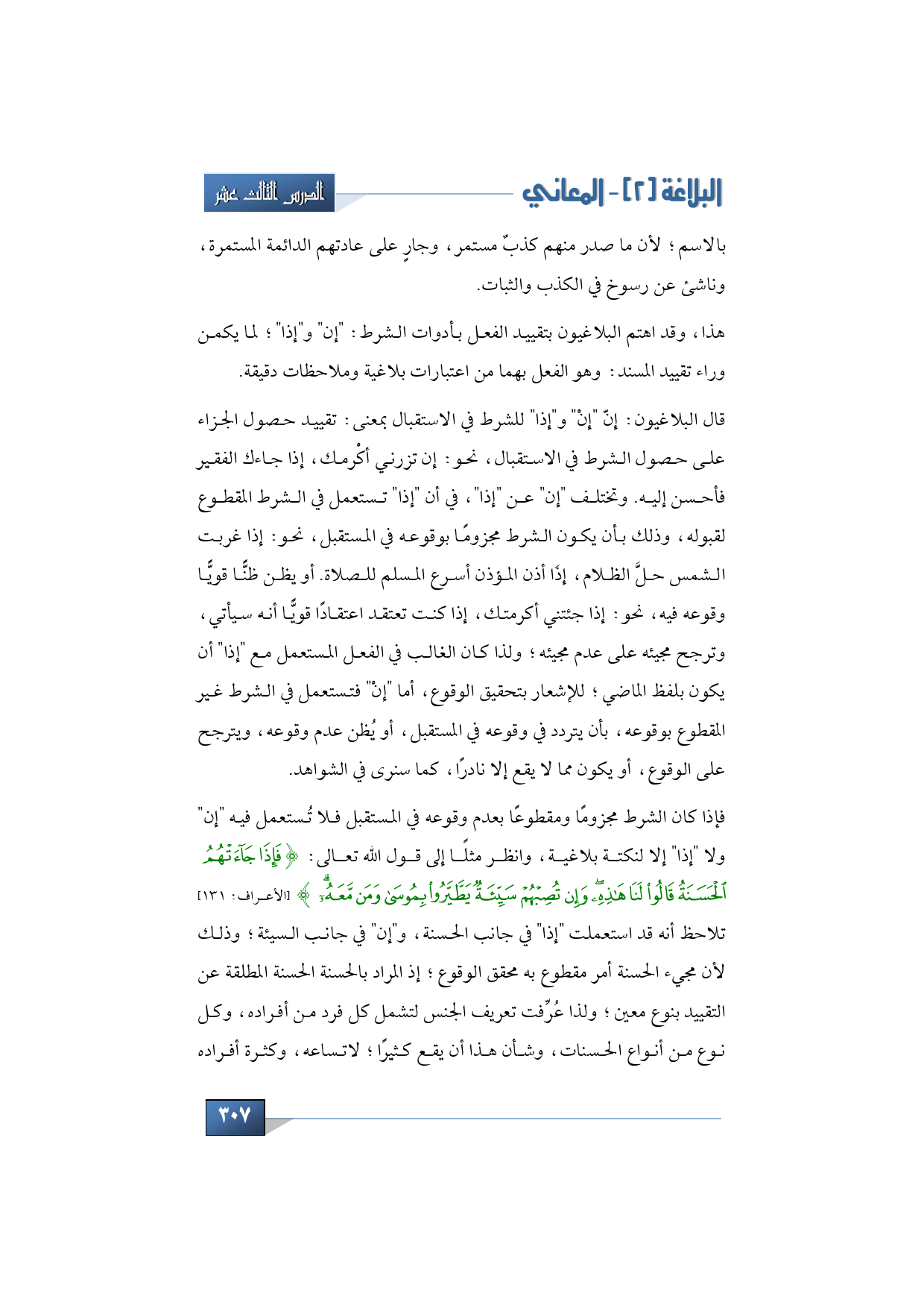 هذا وقد اهتم البلاغيون بتقييد الفعل بأدوات الشرط: "إن" و"إذا"؛ لما يكمن وراء تقييد المسند: وهو الفعل بهما من اعتبارات بلاغية وملاحظات دقيقة.