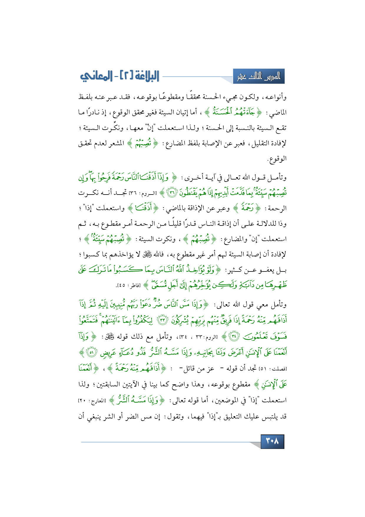 وتأمل قول الله تعالى في آية أخرى: {وَإِذَا أَذَقْنَا النَّاسَ رَحْمَةً فَرِحُوا بِهَا وَإِنْ تُصِبْهُمْ سَيِّئَةٌ بِمَا قَدَّمَتْ أَيْدِيهِمْ إِذَا هُمْ يَقْنَطُونَ} (الروم: 36). تجد أنه نكرت الرحمة: {وَإِذَا أَذَقْنَا النَّاسَ رَحْمَةً}، وعبر عن الإذاقة بالماضي: {أَذَقْنَا}، واستعملت "إذا"؛ وذا للدلالة على أن إذاقة الناس قدرًا قليلًا من الرحمة أمر مقطوع به، ثم استعملت "إن" والمضارع: {تُصِبْهُمْ}، ونكرت السيئة {تُصِبْهُمْ سَيِّئَةٌ}؛ لإفادة أن إصابة السيئة لهم أمر غير مقطوع به، فالله -عز وجل- لا يؤاخذهم بما كسبوا بل يعفو عن كثير: {وَلَوْ يُؤَاخِذُ اللَّهُ النَّاسَ بِمَا كَسَبُوا مَا تَرَكَ عَلَى ظَهْرِهَا مِنْ دَابَّةٍ وَلَكِنْ يُؤَخِّرُهُمْ إِلَى أَجَلٍ مُسَمًّى} (فاطر: 45).