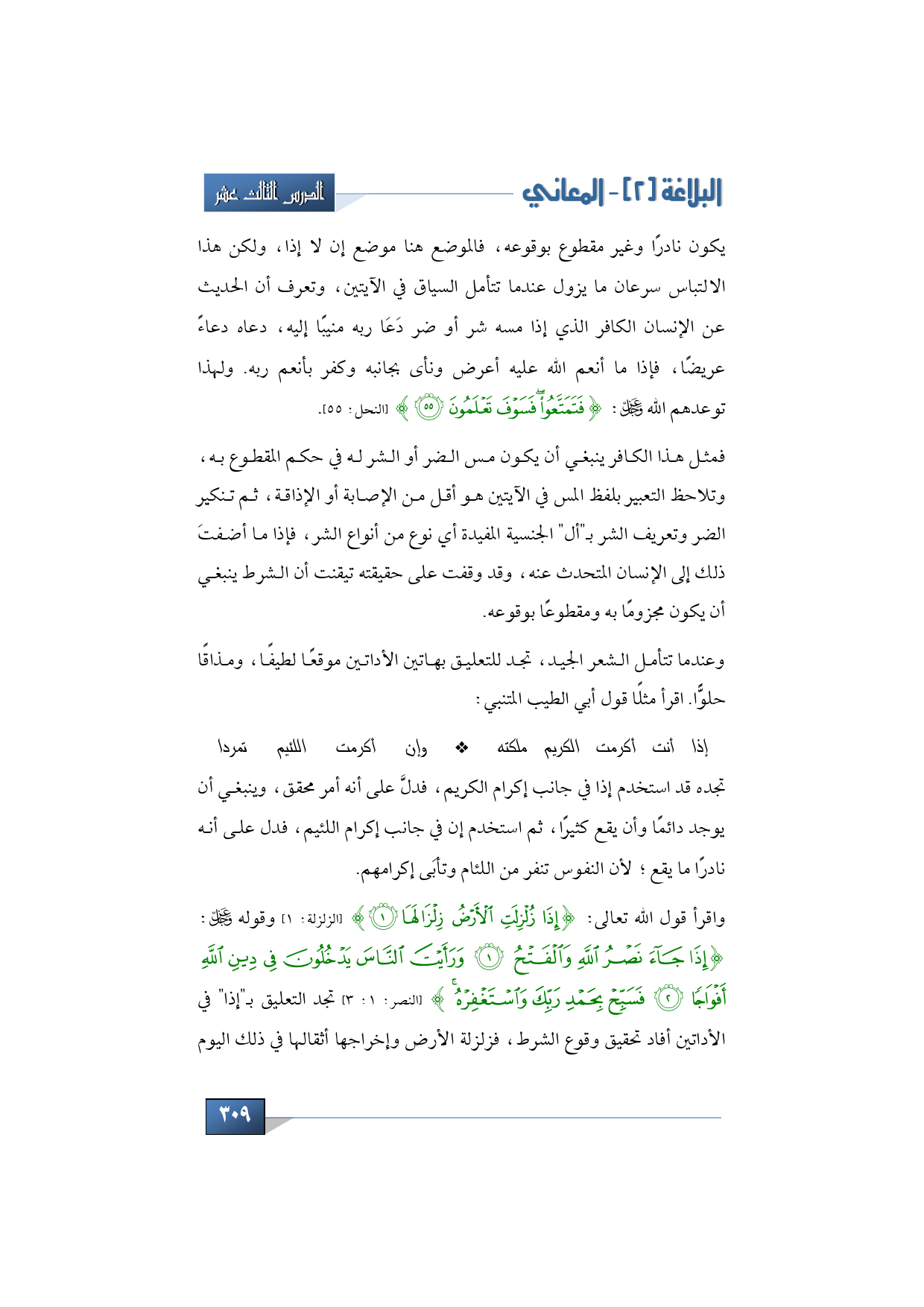 يكون نادرًا وغير مقطوع بوقوعه، فالموضع هنا موضع إن لا إذا، ولكن هذا الالتباس سرعان ما يزول عندما تتأمل السياق في الآيتين، وتعرف أن الحديث عن الإنسان الكافر الذي إذا مسه شر أو ضر دَعَا ربه منيبًا إليه، دعاه دعاءً عريضًا، فإذا ما أنعم الله عليه أعرض ونأى بجانبه وكفر بأنعم ربه. ولهذا توعدهم الله -عز وجل-: {فَتَمَتَّعُوا فَسَوْفَ تَعْلَمُونَ} (النحل: 55).