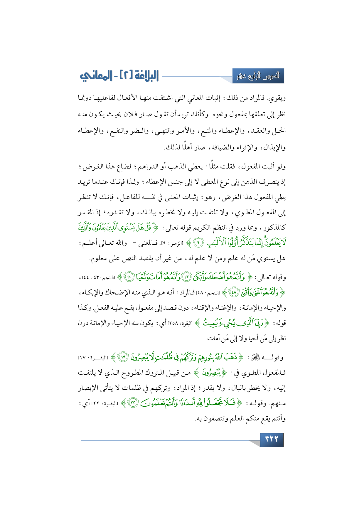 ولو أثبت المفعول، فقلت مثلًا: يعطي الذهب أو الدراهم؛ لضاع هذا الغرض؛ إذ ينصرف الذهن إلى نوع المعطى لا إلى جنس الإعطاء؛ ولذا فإنك عندما تريد بِطِي المفعول هذا الغرض، وهو: إثبات المعنى في نفسه للفاعل، فإنك لا تنظر إلى المفعول المطوي، ولا تلتفت إليه ولا تخطره ببالك، ولا تقدره؛ إذ المقدر كالمذكور، ومما ورد في النظم الكريم قوله تعالى: {قُلْ هَلْ يَسْتَوِي الَّذِينَ يَعْلَمُونَ وَالَّذِينَ لَا يَعْلَمُونَ إِنَّمَا يَتَذَكَّرُ أُولُو الْأَلْبَابِ} (الزمر: 9). فالمعنى -والله تعالى أعلم-: هل يستوي مَن له علم ومن لا علم له، من غير أن يقصد النص على معلوم.