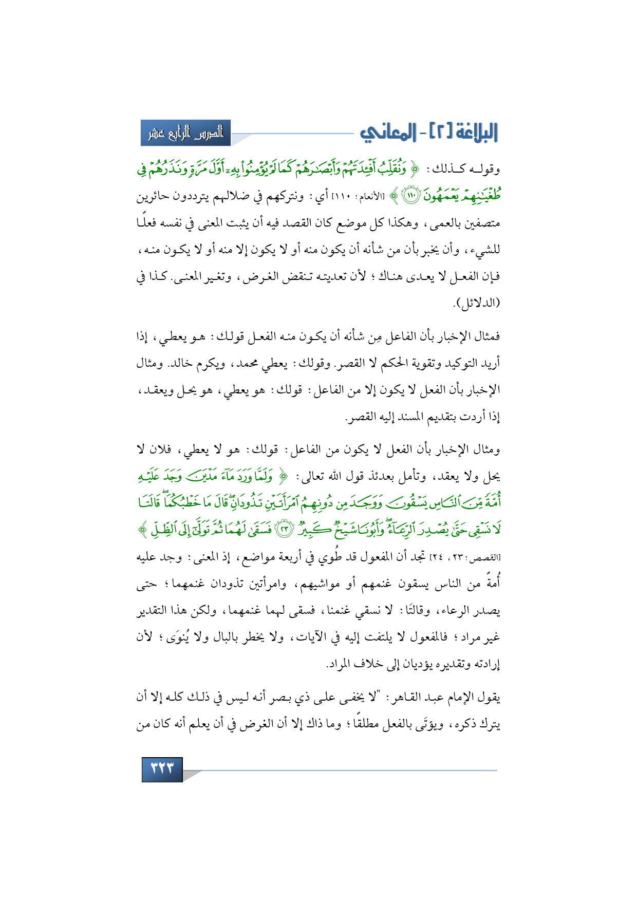ومثال الإخبار بأن الفعل لا يكون من الفاعل: قولك: هو لا يعطي، فلان لا يحل ولا يعقد، وتأمل بعدئذ قول الله تعالى: {وَلَمَّا وَرَدَ مَاءَ مَدْيَنَ وَجَدَ عَلَيْهِ أُمَّةً مِنَ النَّاسِ يَسْقُونَ وَوَجَدَ مِنْ دُونِهِمُ امْرَأتَيْنِ تَذُودَانِ قَالَ مَا خَطْبُكُمَا قَالَتَا لَا نَسْقِي حَتَّى يُصْدِرَ الرِّعَاءُ وَأَبُونَا شَيْخٌ كَبِيرٌ * فَسَقَى لَهُمَا ثُمَّ تَوَلَّى إِلَى الظِّلِّ} (القصص:23، 24). تجد أن المفعول قد طُوي في أربعة مواضع، إذ المعنى: وجد عليه أُمةً من الناس يسقون غنمهم أو مواشيهم، وامرأتين تذودان غنمهما؛ حتى يصدر الرعاء، وقالتَا: لا نسقي غنمنا، فسقى لهما غنمهما، ولكن هذا التقدير غير مراد؛ فالمفعول لا يلتفت إليه في الآيات، ولا يخطر بالبال ولا يُنوَى؛ لأن إرادته وتقديره يؤديان إلى خلاف المراد.