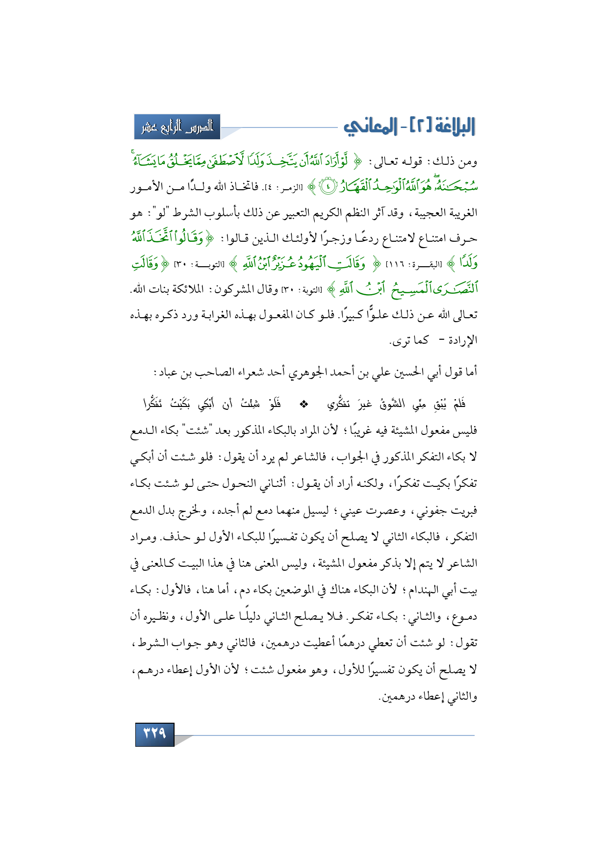 ومن ذلك: قوله تعالى: {لَوْ أَرَادَ اللَّهُ أَنْ يَتَّخِذَ وَلَدًا لَاصْطَفَى مِمَّا يَخْلُقُ مَا يَشَاءُ سُبْحَانَهُ هُوَ اللَّهُ الْوَاحِدُ الْقَهَّارُ} (الزمر: 4). فاتخاذ الله ولدًَا من الأمور الغريبة العجيبة، وقد آثر النظم الكريم التعبير عن ذلك بأسلوب الشرط "لو": هو حرف امتناع لامتناع ردعًا وزجرًا لأولئك الذين قالوا: {اتَّخَذَ اللَّهُ وَلَدًا} (البقرة: 116) {وَقَالَتِ الْيَهُودُ عُزَيْرٌ ابْنُ اللَّهِ} (التوبة: 30) {وَقَالَتِ النَّصَارَى الْمَسِيحُ ابْنُ اللَّهِ} (التوبة: 30) وقال المشركون: الملائكة بنات الله. تعالى الله عن ذلك علوًّا كبيرًا. فلو كان المفعول بهذه الغرابة ورد ذكره بهذه الإرادة -كما ترى -. أما قول أبي الحسين علي بن أحمد الجوهري أحد شعراء الصاحب بن عباد: