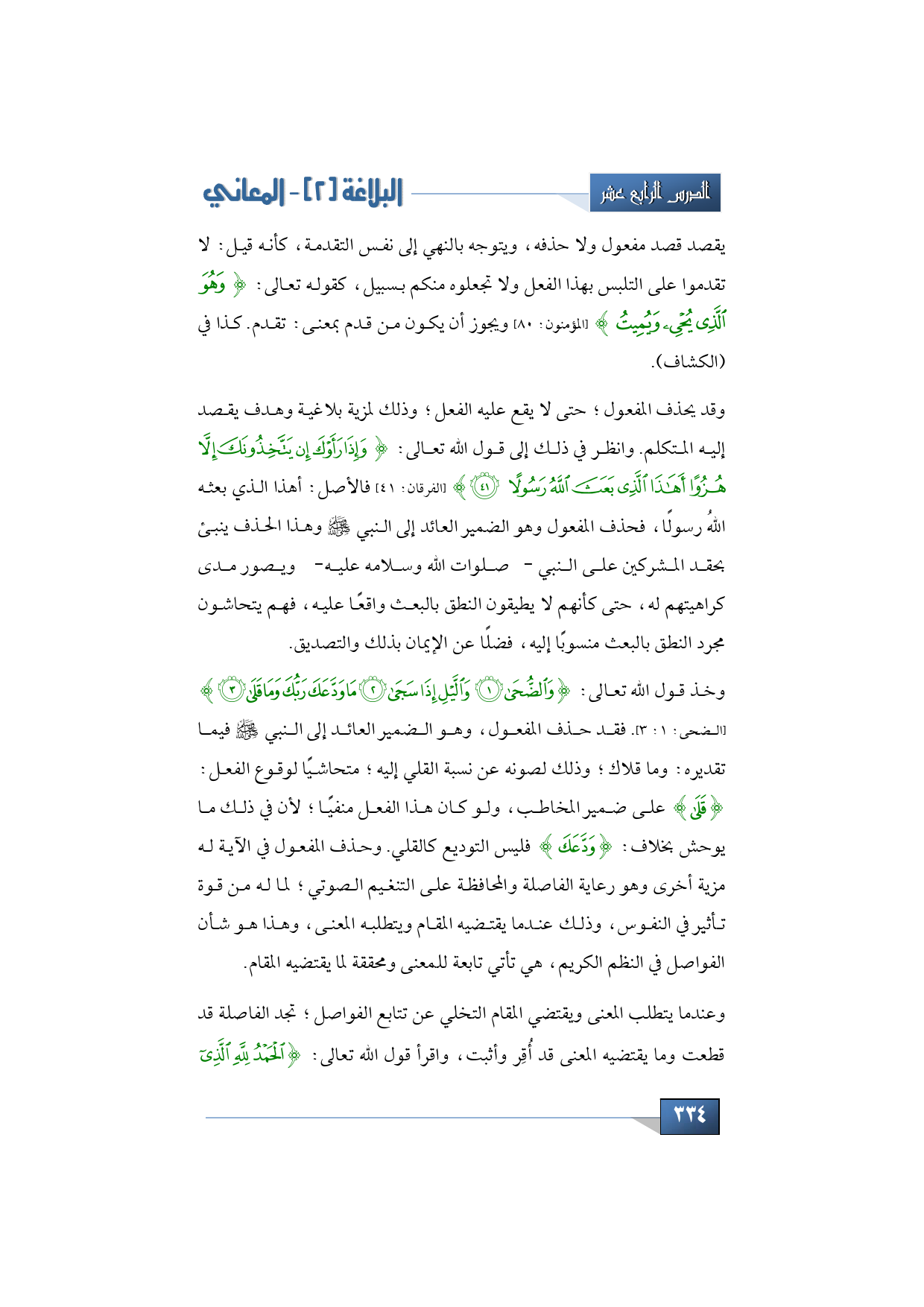 وخذ قول الله تعالى: {وَالضُّحَى * وَاللَّيْلِ إِذَا سَجَى * مَا وَدَّعَكَ رَبُّكَ وَمَا قَلَى} (الضحى: 1: 3). فقد حذف المفعول، وهو الضمير العائد إلى النبي -صلى الله عليه وسلم- فيما تقديره: وما قلاك؛ وذلك لصونه عن نسبة القلي إليه؛ متحاشيًا لوقوع الفعل: {قَلَى} على ضمير المخاطب، ولو كان هذا الفعل منفيًا؛ لأن في ذلك ما يوحش بخلاف: {وَدَّعَكَ} فليس التوديع كالقلي. وحذف المفعول في الآية له مزية أخرى وهو رعاية الفاصلة والمحافظة على التنغيم الصوتي؛ لما له من قوة تأثير في النفوس، وذلك عندما يقتضيه المقام ويتطلبه المعنى، وهذا هو شأن الفواصل في النظم الكريم، هي تأتي تابعة للمعنى ومحققة لما يقتضيه المقام.