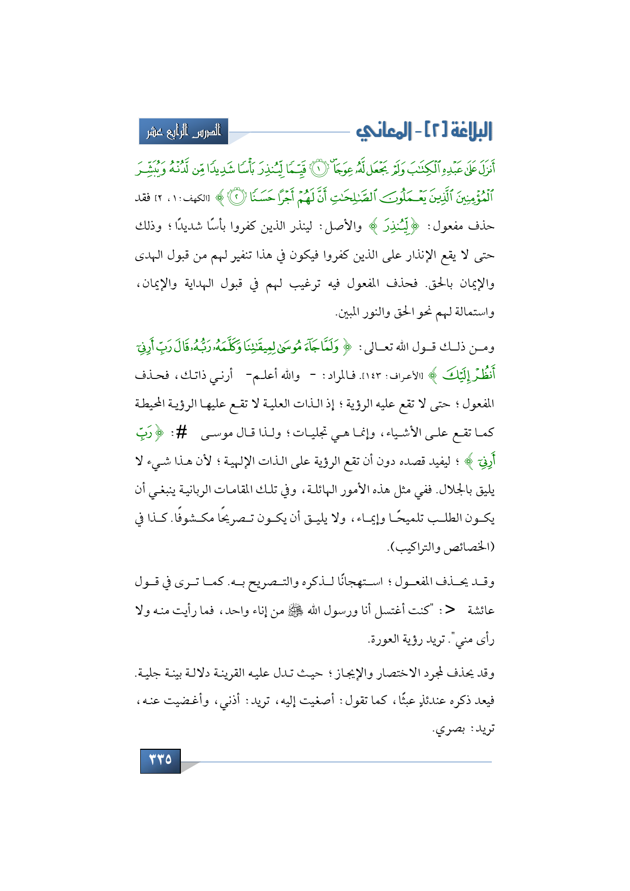 أَنْزَلَ عَلَى عَبْدِهِ الْكِتَابَ وَلَمْ يَجْعَلْ لَهُ عِوَجَا * قَيِّمًا لِيُنْذِرَ بَأْسًا شَدِيدًا مِنْ لَدُنْهُ وَيُبَشِّرَ الْمُؤْمِنِينَ الَّذِينَ يَعْمَلُونَ الصَّالِحَاتِ أَنَّ لَهُمْ أَجْرًا حَسَنًا} (الكهف:1، 2). فقد حذف مفعول: {لِيُنْذِرَ} والأصل: لينذر الذين كفروا بأسًا شديدًا؛ وذلك حتى لا يقع الإنذار على الذين كفروا فيكون في هذا تنفير لهم من قبول الهدى والإيمان بالحق. فحذف المفعول فيه ترغيب لهم في قبول الهداية والإيمان، واستمالة لهم نحو الحق والنور المبين.