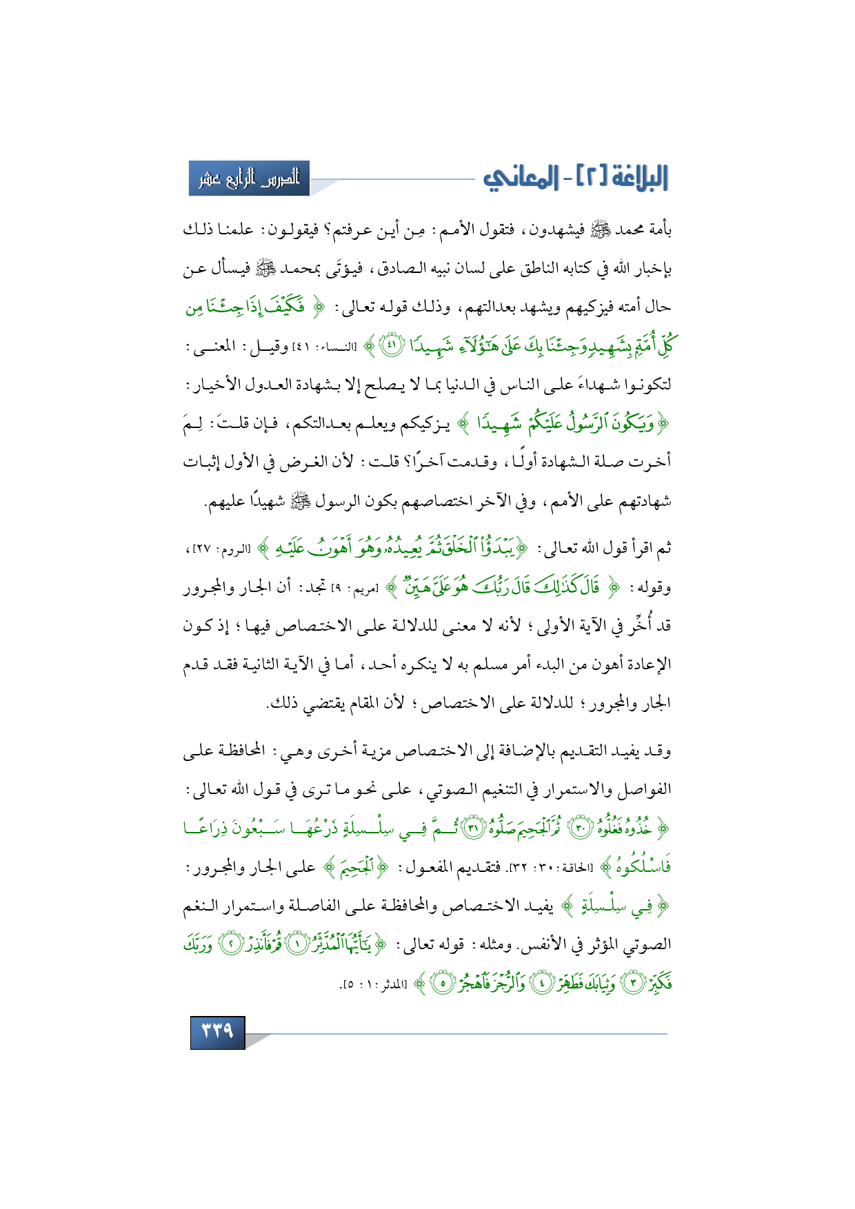 وقد يفيد التقديم بالإضافة إلى الاختصاص مزية أخرى وهي: المحافظة على الفواصل والاستمرار في التنغيم الصوتي، على نحو ما ترى في قول الله تعالى: {خُذُوهُ فَغُلُّوهُ * ثُمَّ الْجَحِيمَ صَلُّوهُ * ثُمَّ فِي سِلْسِلَةٍ ذَرْعُهَا سَبْعُونَ ذِرَاعًا فَاسْلُكُوهُ} (الحاقة:30: 32). فتقديم المفعول: {الْجَحِيمَ} على الجار والمجرور: {فِي سِلْسِلَةٍ} يفيد الاختصاص والمحافظة على الفاصلة واستمرار النغم الصوتي المؤثر في الأنفس. ومثله: قوله تعالى: {يَا أَيُّهَا الْمُدَّثِّرُ * قُمْ فَأَنْذِرْ * وَرَبَّكَ فَكَبِّرْ * وَثِيَابَكَ فَطَهِّرْ * وَالرُّجْزَ فَاهْجُرْ} (المدثر:1: 5).