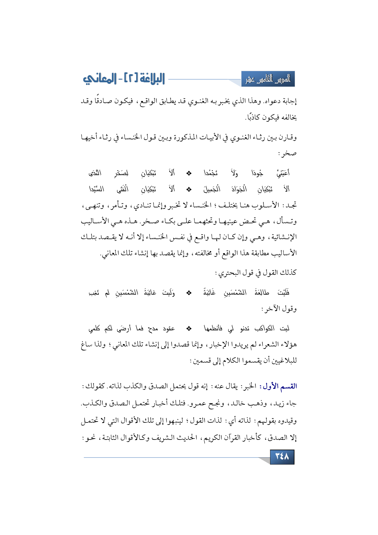 تجد: الأسلوب هنا يختلف؛ الخنساء لا تخبر وإنما تنادي، وتأمر، وتنهى، وتسأل، هي تحض عينيها وتحثهما على بكاء صخر. هذه هي الأساليب الإنشائية، وهي وإن كان لها واقع في نفس الخنساء إلا أنه لا يقصد بتلك الأساليب مطابقة هذا الواقع أو مخالفته، وإنما يقصد بها إنشاء تلك المعاني.
