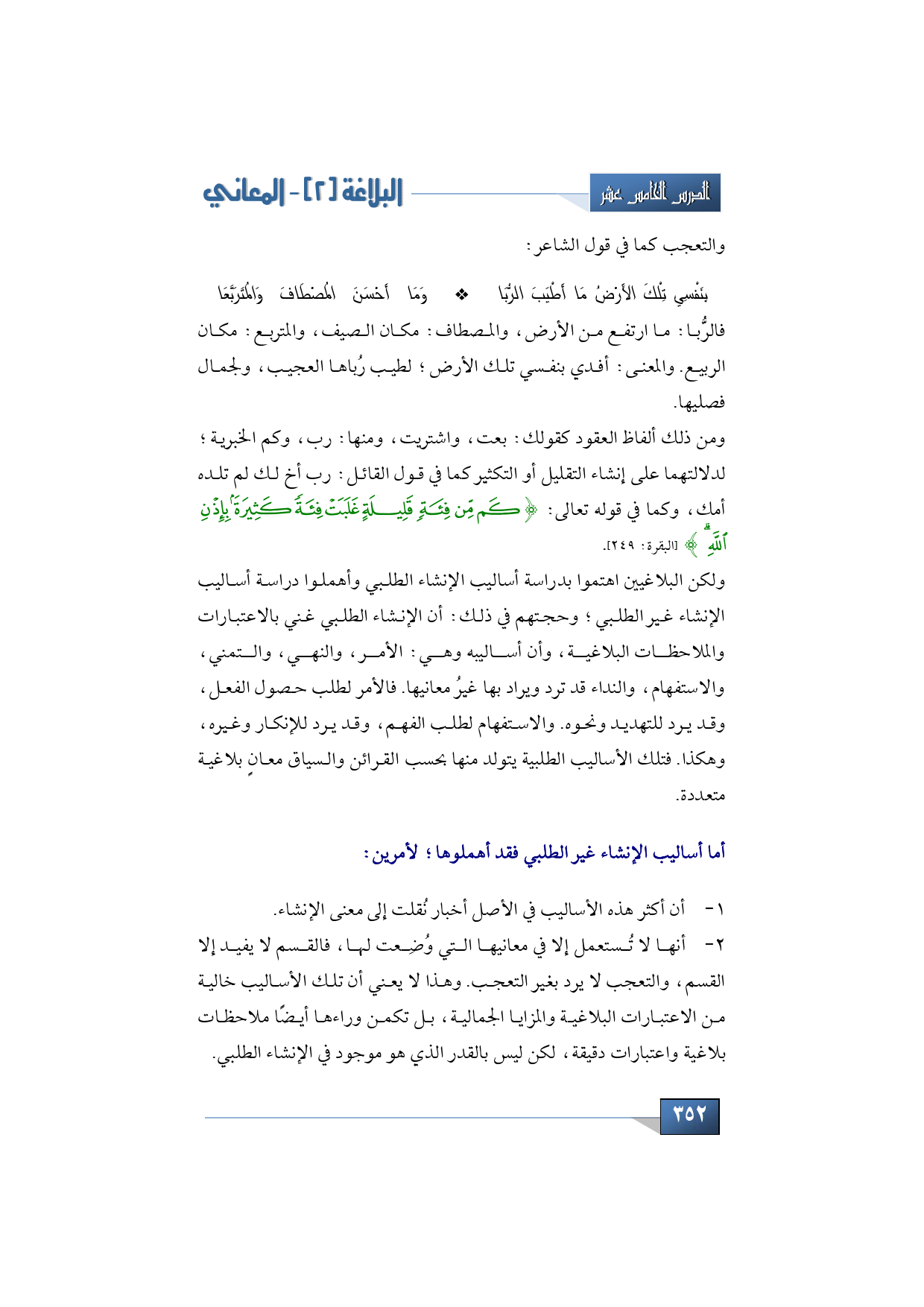 2 - أنها لا تُستعمل إلا في معانيها التي وُضِعت لها، فالقسم لا يفيد إلا القسم، والتعجب والتعجب لا يرد بغير التعجب. وهذا لا يعني أن تلك الأساليب خالية من الاعتبارات البلاغية والمزايا الجمالية، بل تكمن وراءها أيضًا ملاحظات بلاغية واعتبارات دقيقة، لكن ليس بالقدر الذي هو موجود في الإنشاء الطلبي.