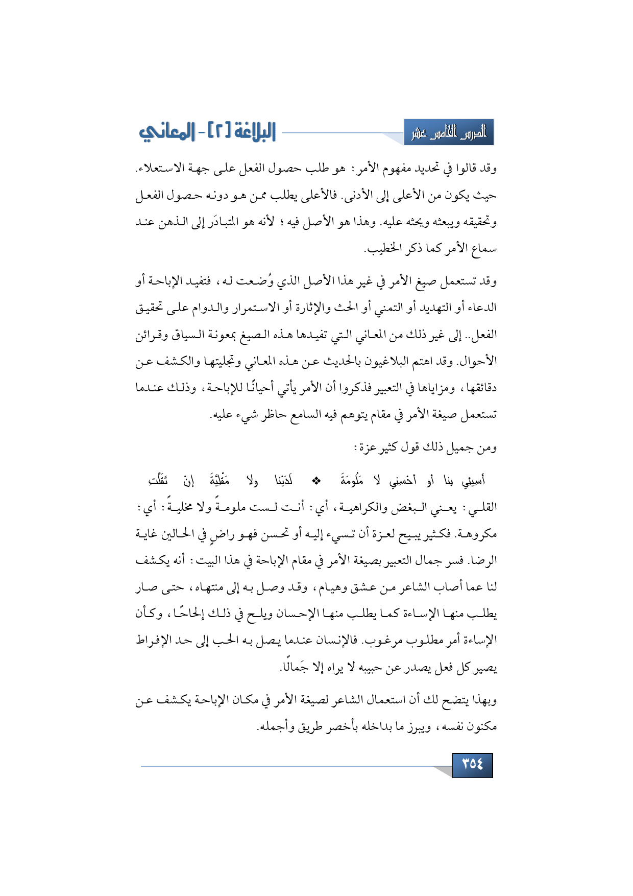القلي: يعني البغض والكراهية، أي: أنت لست ملومةً ولا مخليةً: أي: مكروهة. فكثير يبيح لعزة أن تسيء إليه أو تحسن فهو راضٍ في الحالين غاية الرضا. فسر جمال هذا التعبير -أي: التعبير بصيغة الأمر في مقام الإباحة في هذا البيت- أنه يكشف لنا عما أصاب الشاعر من عشق وهيام، وقد وصل به إلى منتهاه، حتى صار يطلب منها الإساءة كما يطلب منها الإحسان ويلح في ذلك إلحاحًا، وكأن الإساءة أمر مطلوب مرغوب. فالإنسان عندما يصل به الحب إلى حد الإفراط يصير كل فعل يصدر عن حبيبه لا يراه إلا جَمالًا.