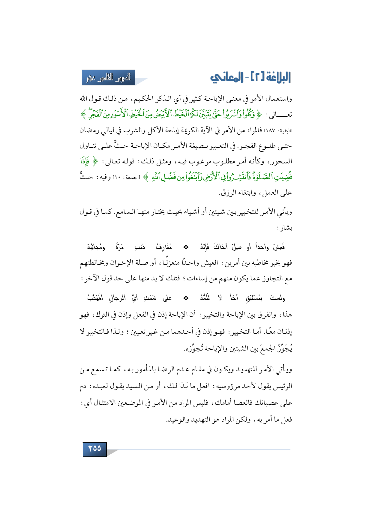 واستعمال الأمر في معنى الإباحة كثير في آي الذكر الحكيم، من ذلك قول الله تعالى: {وَكُلُوا وَاشْرَبُوا حَتَّى يَتَبَيَّنَ لَكُمُ الْخَيْطُ الْأَبْيَضُ مِنَ الْخَيْطِ الْأَسْوَدِ مِنَ الْفَجْرِ} (البقرة: 187) فالمراد من الأمر في الآية الكريمة إباحة الأكل والشرب في ليالي رمضان حتى طلوع الفجر. في التعبير بصيغة الأمر مكان الإباحة حثٌّ على تناول السحور، وكأنه أمر مطلوب مرغوب فيه، ومثل ذلك: قوله تعالى: {فَإِذَا قُضِيَتِ الصَّلَاةُ فَانْتَشِرُوا فِي الْأَرْضِ وَابْتَغُوا مِنْ فَضْلِ اللَّهِ} (الجمعة: 10) وفيه: حثٌّ على العمل، وابتغاء الرزق.