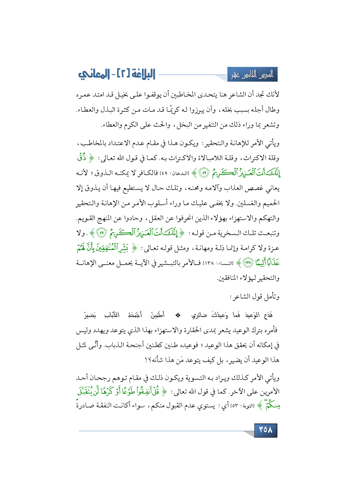 ويأتي الأمر للإهانة والتحقير: ويكون هذا في مقام عدم الاعتداد بالمخاطب، وقلة الاكتراث، وقلة اللامبالاة والاكتراث به. كما في قول الله تعالى: {ذُقْ إِنَّكَ أَنْتَ الْعَزِيزُ الْكَرِيمُ} (الدخان: 49). فالكافر لا يمكنه الذوق؛ لأنه يعاني غصص العذاب وآلامه ومحنه، وتلك حال لا يستطيع فيها أن يذوق إلا الحميم والغسلين. ولا يخفى عليك ما وراء أسلوب الأمر من الإهانة والتحقير والتهكم والاستهزاء بهؤلاء الذين انحرفوا عن العقل، وحادوا عن المنهج القويم. وتنبعث تلك السخرية من قوله: {إِنَّكَ أَنْتَ الْعَزِيزُ الْكَرِيمُ}. ولا عزة ولا كرامة وإنما ذِلة ومهانة، ومثل قوله تعالى: {بَشِّرِ الْمُنَافِقِينَ بِأَنَّ لَهُمْ عَذَابًا أَلِيمًا} (النساء: 138). فالأمر بالتبشير في الآية يحمل معنى الإهانة والتحقير لهؤلاء المنافقين.
