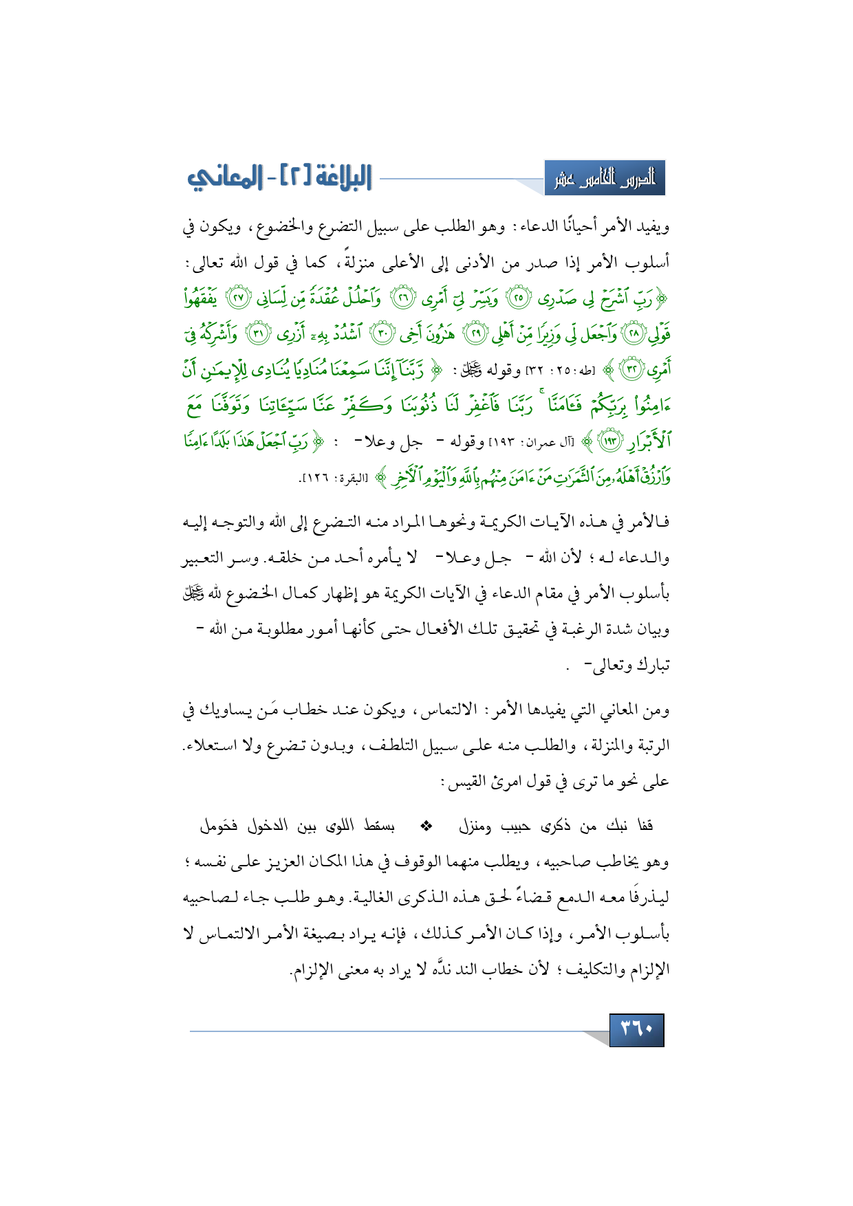 ومن المعاني التي يفيدها الأمر: الالتماس، ويكون عند خطاب مَن يساويك في الرتبة والمنزلة، والطلب منه على سبيل التلطف، وبدون تضرع ولا استعلاء. على نحو ما ترى في قول امرئ القيس: