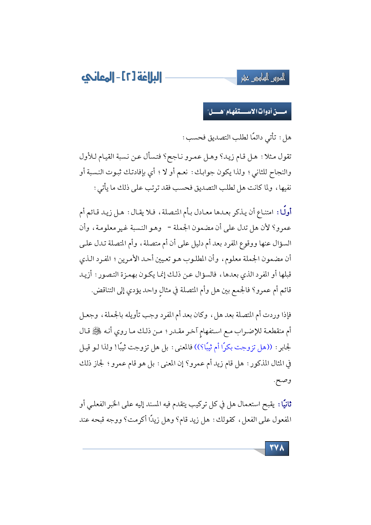 تقول مثلا: هل قام زيد؟ وهل عمرو ناجح؟ فتسأل عن نسبة القيام للأول والنجاح للثاني؛ ولذا يكون جوابك: نعم أو لا؛ أي بإفادتك ثبوت النسبة أو نفيها، ولما كانت هل لطلب التصديق فحسب فقد ترتب على ذلك ما يأتي؛ أولًا: امتناع أن يذكر بعدها معادل بأم المتصلة، فلا يقال: هل زيد قائم أم عمرو؟ لأن هل تدل على أن مضمون الجملة -وهو النسبة غير معلومة، وأن السؤال عنها ووقوع المفرد بعد أم دليل على أن أم متصلة، وأم المتصلة تدل على أن مضمون الجملة معلوم، وأن المطلوب هو تعيين أحد الأمرين؛ المفرد الذي قبلها أو المفرد الذي بعدها، فالسؤال عن ذلك إنما يكون بهمزة التصور: أزيد قائم أم عمرو؟ فالجمع بين هل وأم المتصلة في مثالٍ واحد يؤدي إلى التناقض. فإذا وردت أم المتصلة بعد هل، وكان بعد أم المفرد وجب تأويله بالجملة، وجعل أم منقطعة للإضراب مع استفهامٍ آخر مقدر؛ من ذلك ما روي أنه -صلى الله عليه وسلم- قال لجابر: ((هل تزوجت بكرًا أم ثيبًا؟)) فالمعنى: بل هل تزوجت ثيبًا! ولذا لو قيل في المثال المذكور: هل قام زيد أم عمرو؟ إن المعنى: بل هو قام عمرو؛ لجاز ذلك وصح.