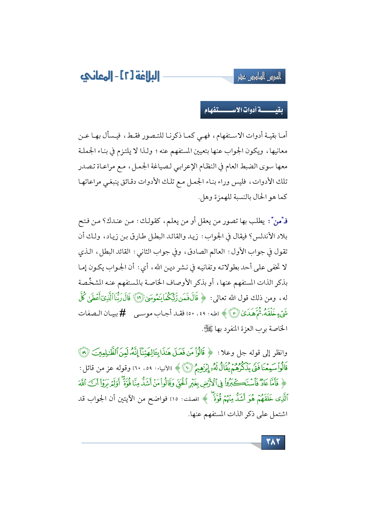 أما بقية أدوات الاستفهام، فهي كما قلنا للتصور فقط، فيسأل بها عن معانيها، ويكون الجواب عنها بتعيين المستفهم عنه؛ ولذا لا يلتزم في بناء الجملة معها سوى الضبط العام في النظام الإعرابي لصياغة الجمل، مع مراعاة تصدر تلك الأدوات كما قلنا، فليس وراء بناء الجمل مع تلك الأدوات دقائق ينبغي مراعاتها كما هو الحال بالنسبة للهمزة وهل. فـ"من" يطلب بها تصور من يعقل أو من يعلم، كقولك: من عندك؟ من فتح بلاد الأندلس؟ فيقال في الجواب: زيد والقائد البطل طارق بن زياد، ولك أن تقول في جواب الأول: العالم الصادق، وفي جواب الثاني: القائد البطل، الذي لا تخفى على أحد بطولاته وتفانيه في نشر دين الله، أي: أن الجواب يكون إما بذكر الذات المستفهم عنها، أو بذكر الأوصاف الخاصة بالمستفهم عنه المشخِّصة له، ومن ذلك قول الله تعالى: {قَالَ فَمَنْ رَبُّكُمَا يَا مُوسَى * قَالَ رَبُّنَا الَّذِي أَعْطَى كُلَّ شَيْءٍ خَلْقَهُ ثُمَّ هَدَى} (طه: 49، 50) فقد أجاب موسى -عليه السلام- ببيان الصفات الخاصة برب العزة المنفرد بها سبحانه وتعالى.