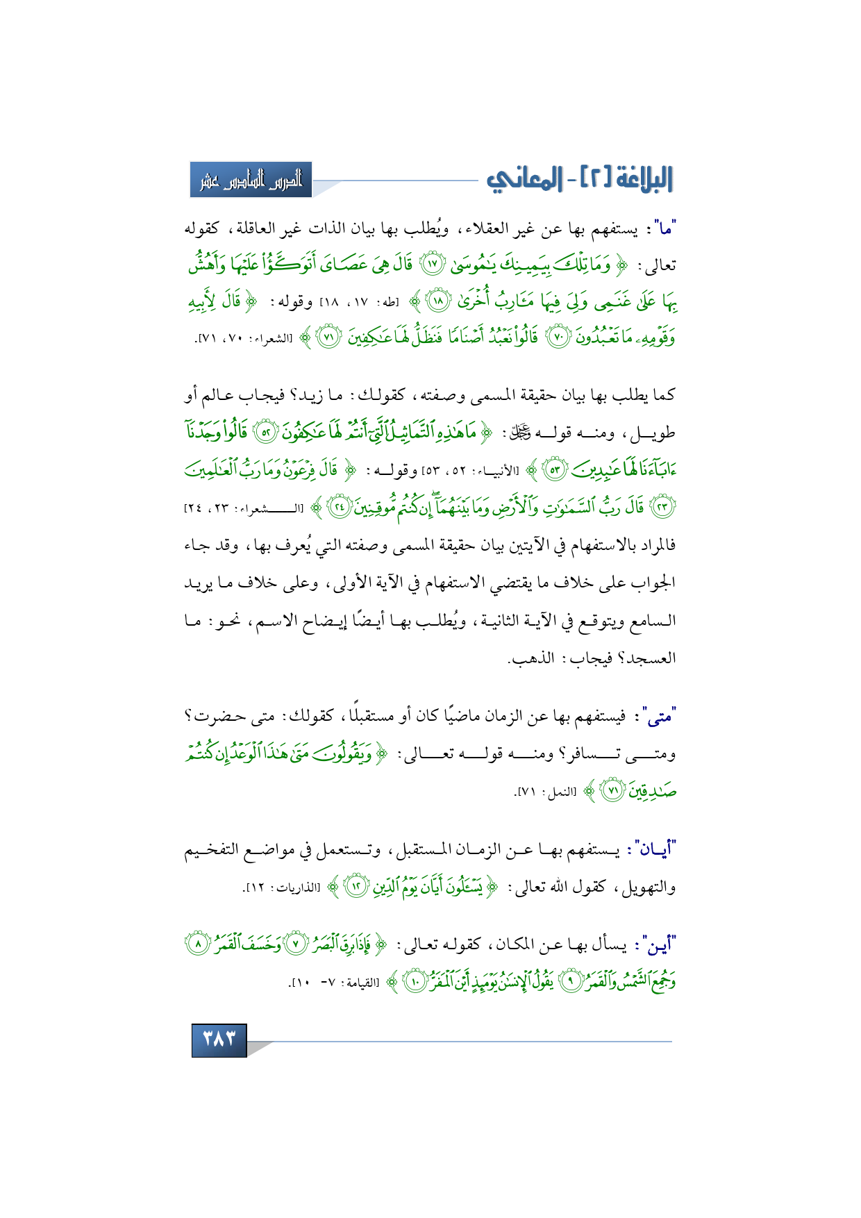 و"ما" يستفهم بها عن غير العقلاء، ويُطلب بها بيان الذات غير العاقلة، كقوله تعالى: {وَمَا تِلْكَ بِيَمِينِكَ يَا مُوسَى * قَالَ هِيَ عَصَايَ أَتَوَكَّأُ عَلَيْهَا وَأَهُشُّ بِهَا عَلَى غَنَمِي وَلِيَ فِيهَا مَآرِبُ أُخْرَى} (طه: 17، 18) وقوله: {قَالَ لِأَبِيهِ وَقَوْمِهِ مَا تَعْبُدُونَ * قَالُوا نَعْبُدُ أَصْنَامًا فَنَظَلُّ لَهَا عَاكِفِينَ} (الشعراء: 70، 71) كما يطلب بها بيان حقيقة المسمى وصفته، كقولك: ما زيد؟ فيجاب عالم أو طويل، ومنه قوله عز وجل: {مَا هَذِهِ التَّمَاثِيلُ الَّتِي أَنْتُمْ لَهَا عَاكِفُونَ * قَالُوا وَجَدْنَا آبَاءَنَا لَهَا عَابِدِينَ} (الأنبياء: 52، 53) وقوله: {قَالَ فِرْعَوْنُ وَمَا رَبُّ الْعَالَمِينَ * قَالَ رَبُّ السَّمَاوَاتِ وَالْأَرْضِ وَمَا بَيْنَهُمَا إِنْ كُنْتُمْ مُوقِنِينَ} (الشعراء: 23، 24) فالمراد بالاستفهام في الآيتين بيان حقيقة المسمى وصفته التي يُعرف بها، وقد جاء الجواب على خلاف ما يقتضي الاستفهام في الآية الأولى، وعلى خلاف ما يريد السامع ويتوقع في الآية الثانية، ويُطلب بها أيضًا إيضاح الاسم، نحو: ما العسجد؟ فيجاب: الذهب.