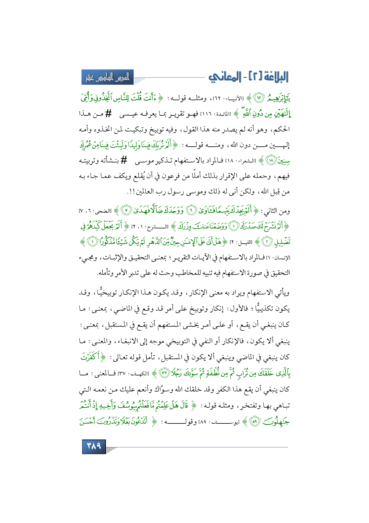 ومن الثاني: {أَلَمْ يَجِدْكَ يَتِيمًا فَآوَى * وَوَجَدَكَ ضَالًّا فَهَدَى} (الضحى: 6، 7) {أَلَمْ نَشْرَحْ لَكَ صَدْرَكَ * وَوَضَعْنَا عَنْكَ وِزْرَكَ} (الشرح: 1، 2) {أَلَمْ يَجْعَلْ كَيْدَهُمْ فِي تَضْلِيلٍ} (الفيل: 2) {هَلْ أَتَى عَلَى الْإِنْسَانِ حِينٌ مِنَ الدَّهْرِ لَمْ يَكُنْ شَيْئًا مَذْكُورًا} (الإنسان: 1) فالمراد بالاستفهام في الآيات التقرير؛ بمعنى التحقيق والإثبات، ومجيء التحقيق في صورة الاستفهام فيه تنبيه للمخاطب وحث له على تدبر الأمر وتأمله.