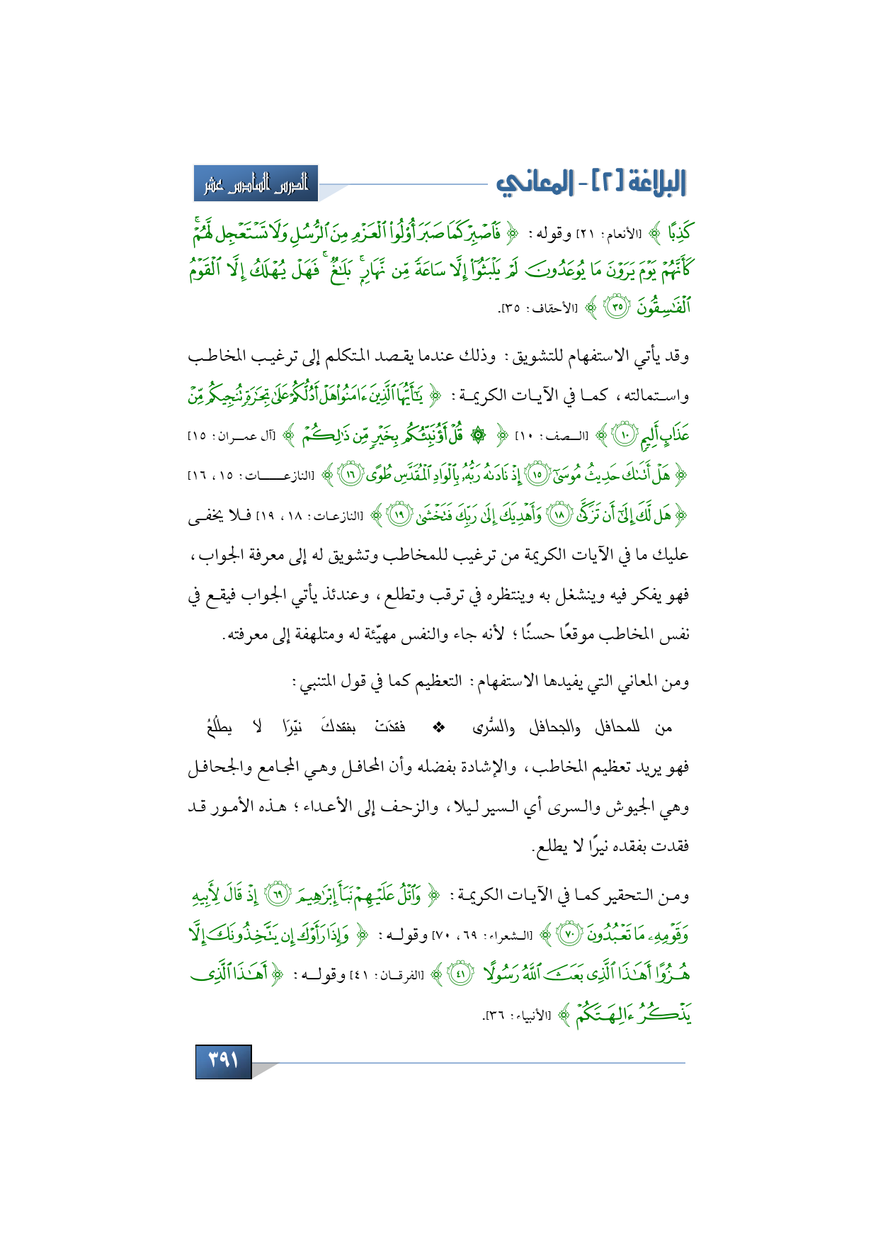 فهو يريد تعظيم المخاطب، والإشادة بفضله وأن المحافل وهي المجامع والجحافل وهي الجيوش والسرى أي السير ليلا، والزحف إلى الأعداء؛ هذه الأمور قد فقدت بفقده نيرًا لا يطلع، ومن التحقير كما في الآيات الكريمة: {وَاتْلُ عَلَيْهِمْ نَبَأَ إِبْرَاهِيمَ * إِذْ قَالَ لِأَبِيهِ وَقَوْمِهِ مَا تَعْبُدُونَ} (الشعراء: 69، 70) وقوله: {وَإِذَا رَأَوْكَ إِنْ يَتَّخِذُونَكَ إِلَّا هُزُوًا أَهَذَا الَّذِي بَعَثَ اللَّهُ رَسُولًا} (الفرقان: 41) وقوله: {أَهَذَا الَّذِي يَذْكُرُ آلِهَتَكُمْ} (الأنبياء: 36)