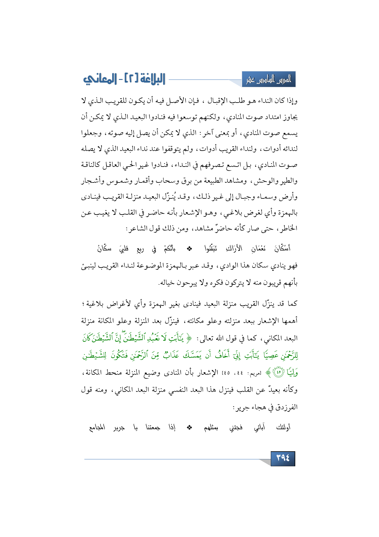 فهو ينادي سكان هذا الوادي، وقد عبر بالهمزة الموضوعة لنداء القريب لينبئ بأنهم قريبون منه لا يتركون فكره ولا يبرحون خياله. كما قد ينزّل القريب منزلة البعيد فينادى بغير الهمزة وأي لأغراض بلاغية؛ أهمها الإشعار ببعد منزلته وعلو مكانته، فينزّل بعد المنزلة وعلو المكانة منزلة البعد المكاني، كما في قول الله تعالى: {يَا أَبَتِ لَا تَعْبُدِ الشَّيْطَانَ إِنَّ الشَّيْطَانَ كَانَ لِلرَّحْمَنِ عَصِيًّا * يَا أَبَتِ إِنِّي أَخَافُ أَنْ يَمَسَّكَ عَذَابٌ مِنَ الرَّحْمَنِ فَتَكُونَ لِلشَّيْطَانِ وَلِيًّا} (مريم: 44، 45) الإشعار بأن المنادى وضيع المنزلة منحط المكانة، وكأنه بعيدٌ عن القلب فينزل هذا البعد النفسي منزلة البعد المكاني، ومنه قول الفرزدق في هجاء جرير: