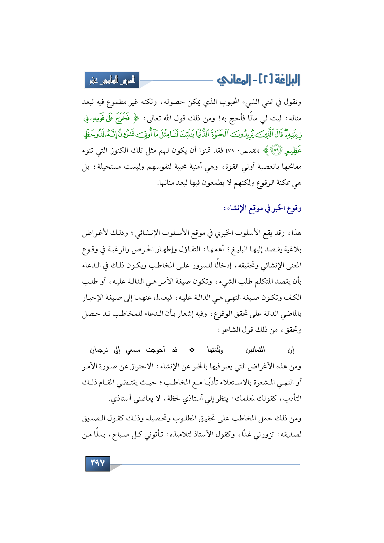 هذا، وقد يقع الأسلوب الخبري في موقع الأسلوب الإنشائي؛ وذلك لأغراض بلاغية يقصد إليها البليغ؛ أهمها: التفاؤل وإظهار الحرص والرغبة في وقوع المعنى الإنشائي وتحقيقه، إدخالًا للسرور على المخاطب ويكون ذلك في الدعاء بأن يقصد المتكلم طلب الشيء، وتكون صيغة الأمر هي الدالة عليه أو طلب الكف، وتكون صيغة النهي هي الدالة عليه، فيعدل عنهما إلى صيغة الإخبار بالماضي الدالة على تحقق الوقوع، وفيه إشعار بأن الدعاء للمخاطب قد حصل وتحقق، من ذلك قول الشاعر: