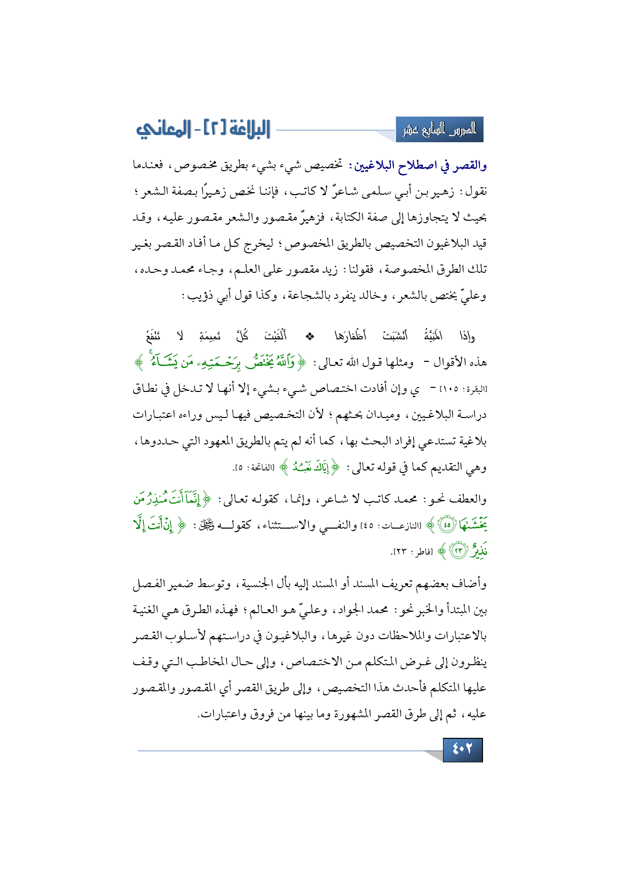 هذه الأقوال -ومثلها قول الله تعالى: {وَاللَّهُ يَخْتَصُّ بِرَحْمَتِهِ مَنْ يَشَاءُ} (البقرة: 105) - هي وإن أفادت اختصاص شيء بشيء إلا أنها لا تدخل في نطاق دراسة البلاغيين، وميدان بحثهم؛ لأن التخصيص فيها ليس وراءه اعتبارات بلاغية تستدعي إفراد البحث بها، كما أنه لم يتم بالطريق المعهود التي حددوها، وهي التقديم كما في قوله تعالى: {إِيَّاكَ نَعْبُدُ} (الفاتحة: 5) والعطف نحو: محمد كاتب لا شاعر، وإنما، كقوله تعالى: {إِنَّمَا أَنْتَ مُنْذِرُ مَنْ يَخْشَاهَا} (النازعات: 45) والنفي والاستثناء، كقوله عز وجل: {إِنْ أَنْتَ إِلَّا نَذِيرٌ} (فاطر: 23) وأضاف بعضهم تعريف المسند أو المسند إليه بأل الجنسية، وتوسط ضمير الفصل بين المبتدأ والخبر نحو: محمد الجواد، وعليّ هو العالم؛ فهذه الطرق هي الغنية بالاعتبارات والملاحظات دون غيرها، والبلاغيون في دراستهم لأسلوب القصر ينظرون إلى غرض المتكلم من الاختصاص، وإلى حال المخاطب التي وقف عليها المتكلم فأحدث هذا التخصيص، وإلى طريق القصر أي المقصور والمقصور عليه، ثم إلى طرق القصر المشهورة وما بينها من فروق واعتبارات.