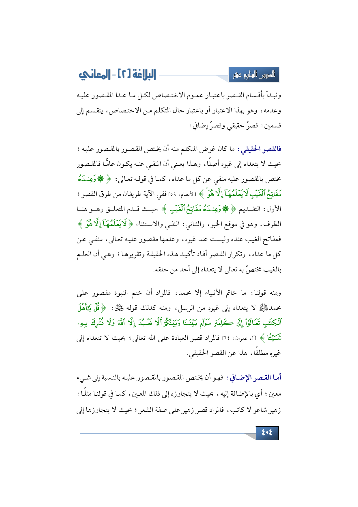ومنه قولنا: ما خاتم الأنبياء إلا محمد، فالمراد أن ختم النبوة مقصور على محمد -صلى الله عليه وسلم- لا يتعداه إلى غيره من الرسل، ومنه كذلك قوله عز وجل: {قُلْ يَا أَهْل الْكِتَابِ تَعَالَوْا إِلَى كَلِمَةٍ سَوَاءٍ بَيْنَنَا وَبَيْنَكُمْ أَلَّا نَعْبُدَ إِلَّا اللَّهَ وَلَا نُشْرِكَ بِهِ شَيْئًا} (آل عمران: 64) فالمراد قصر العبادة على الله تعالى؛ بحيث لا تتعداه إلى غيره مطلقًا، هذا عن القصر الحقيقي، أما القصر الإضافي فهو أن يختص المقصور بالمقصور عليه بالنسبة إلى شيء معين؛ أي بالإضافة إليه، بحيث لا يتجاوزه إلى ذلك المعين، كما في قولنا مثلا: زهير شاعر لا كاتب، فالمراد قصر زهير على صفة الشعر؛ بحيث لا يتجاوزها إلى